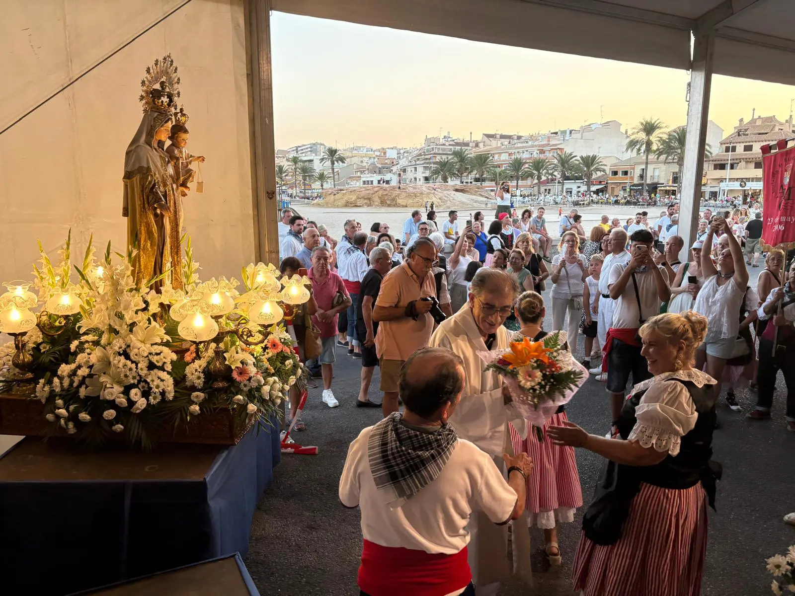 Colectivos cívicos, devotos, integrantes de la Cofradía de Pescadores y autoridades locales, encabezadas por el alcalde Juanjo Berenguer y la concejala de Fiestas y Tradiciones, Marisa Navarro, acompañados por ediles del PP, PSPV-PSOE, Vox, Compromís y Per El Campello.