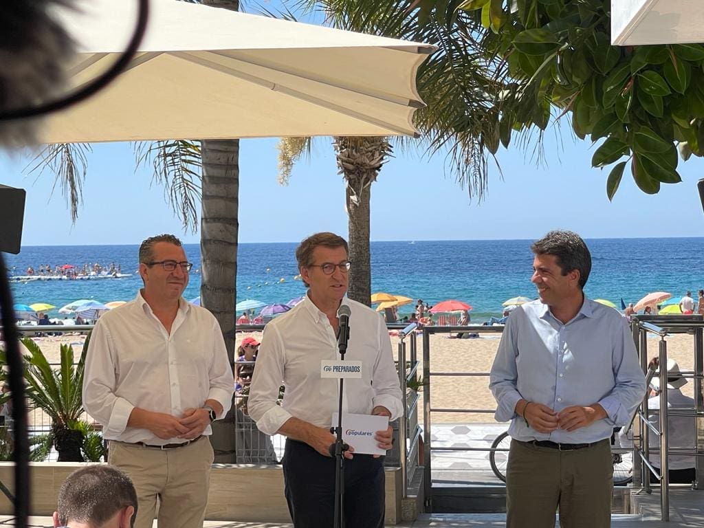 El presidente del PP Alberto Nuñez Feijoó ha comparecido en Benidorm junto al presidnete del PPCV Carlos Mazón y el alcalde de Benidorm Antonio Pérez, para mostrar su posicionamiento respecto a la tasa turística.