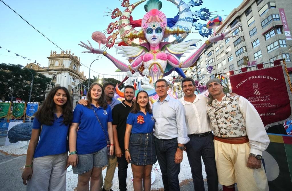 Tras degustar la tradicional coca amb tonyina, los anfitriones han acompañado a Feijóo hasta el barrio de la Florida para que conociera de primera mano la Hoguera Florida-Portazgo, donde ha alabado su remate y donde ha charlado con miembros de la comisión.