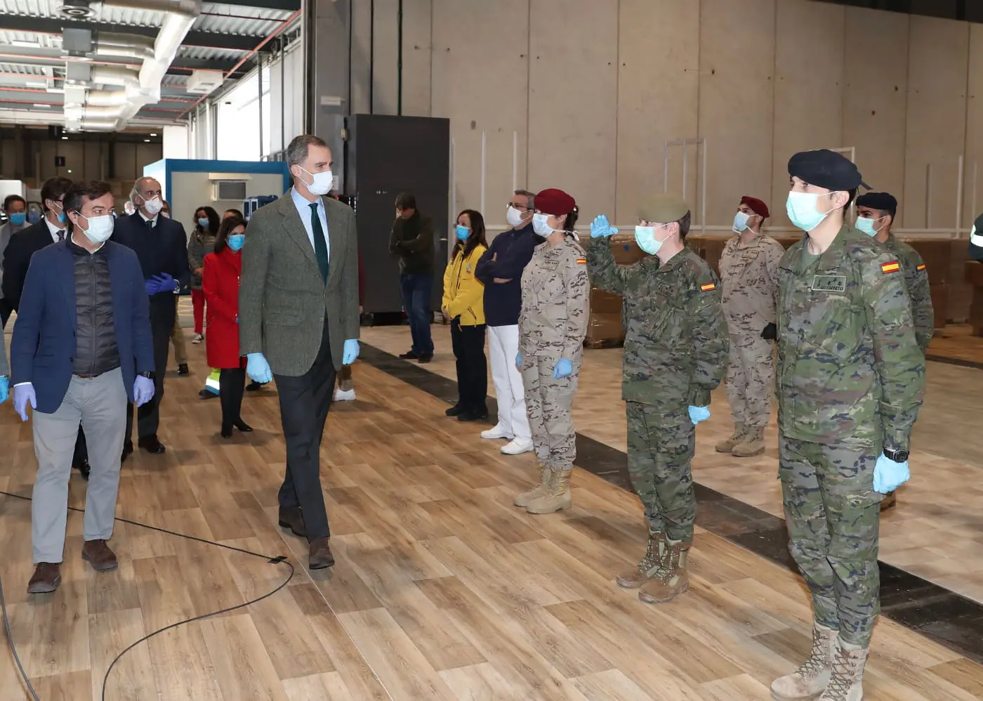 Don Felipe acompañado por el ministro de Sanidad, Salvador Illa; la ministra de Defensa, Margarita Robles; el alcalde de Madrid, José Luis Martínez Almeida; el consejero de Sanidad de la Comunidad de Madrid, Enrique Ruiz Escudero y el director general de IFEMA, Eduardo López-Puertas entre otras autoridades y representantes de la Unidad Militar de Emergencias, visitó el hospital de campaña IFEMA de Emergencia en el que más de un millar de médicos, enfermeras y auxiliares trabajarán para atender a los pacientes con COVID-19.