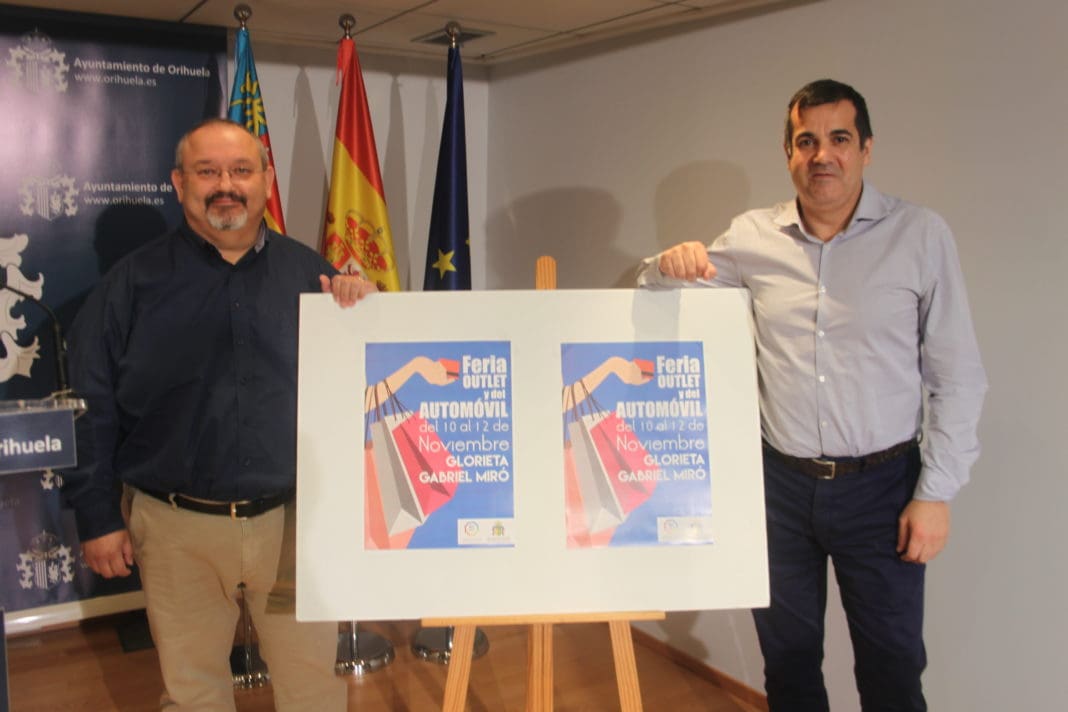 El concejal de Comercio, Miguel Ángel Fernández, junto al vicepresidente de la Asociación de Comerciantes del Municipio de Orihuela (ACMO), Trino Belmar, ha presentado esta mañana una nueva edición de la Feria Outlet de Comercio de Orihuela, que se desarrollará del 10 al 12 de noviembre en la Glorieta Gabriel Miró y se inaugurará este viernes a las 11.00 de la mañana.