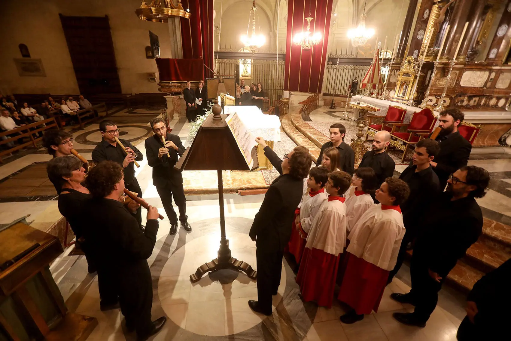 El resultado de horas de investigación y ensayo, durante todo el fin de semana, se vio reflejado anoche en la Basílica de Santa María, en lo que se puede denominar un auténtico regreso al pasado. Alumnos y profesores mostraron al público asistente algunas de las piezas del Oficio de la Virgen de la Asunción, partituras rescatadas del archivo de la iglesia ilicitana. Un verdadero privilegio escuchar estos temas, interpretados al modo original, todos los cantores y ministriles, leyendo en una sola partitura colocada en un gran facistol, construido para la ocasión.