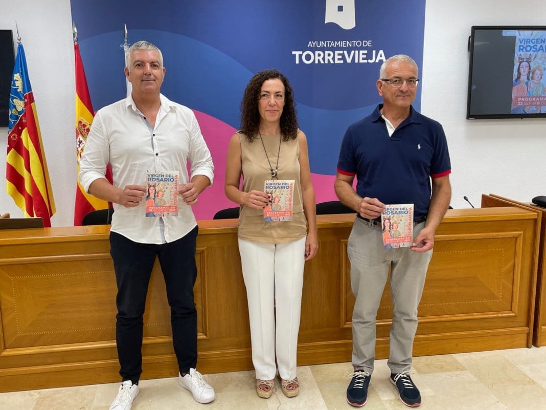 La concejal de Fiestas del Ayuntamiento de La Mata, Rosario Martínez, acompañada del concejal de Medio Ambiente y Playas, Antonio Vidal, y el representante de la Cofradía Nuestra Señora del Rosario de La Mata, Cayetano Gil, han presentado en la mañana de hoy el programa de fiestas en honor a la Virgen del Rosario de La Mata, que se desarrollarán desde el sábado, 23 de septiembre, hasta el domingo, 8 de octubre.