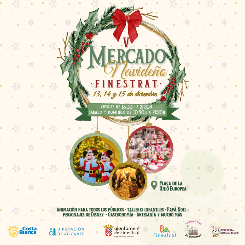 Con este acto entrañable arranca una completa programación para vivir la Navidad en Finestrat con actos como el Mercado Navideño los días 13, 14 y 15 de diciembre. Unos 50 puestos de artesanía gastronomía, juegos y animación llenarán la Plaça de la Unió Europea. Allí recibiremos la visita de Papá Noel y de conocidos personajes de Disney. En ese mismo escenario habrá varios eventos para todos los públicos como el espectáculo de danza ANEMOI Street View, de Rajatabla Danza, (sábado 14, 12:00 horas); la actuación tributo a Il Divo (sábado 14, 20:00 horas); y el musical “Cuentos Mágicos”, de la televisiva cantante Alba Ed-Dounia, conocida por su participación en LA VOZ 2022 (domingo 15, 19:00h).