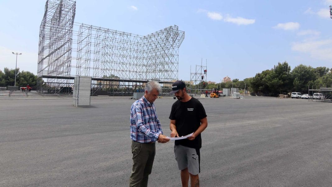 La Ciudad Deportiva Guillermo Amor está ya a punto para albergar la cuarta edición del Reggaeton Beach Festival (RBF) que se celebrará en el recinto municipal el fin de semana del 8 y 9 de julio. Así lo ha comprobado el concejal de Festivales y Eventos, Jesús Carrobles, que ha recorrido las instalaciones junto a personal técnico de la empresa promotora.