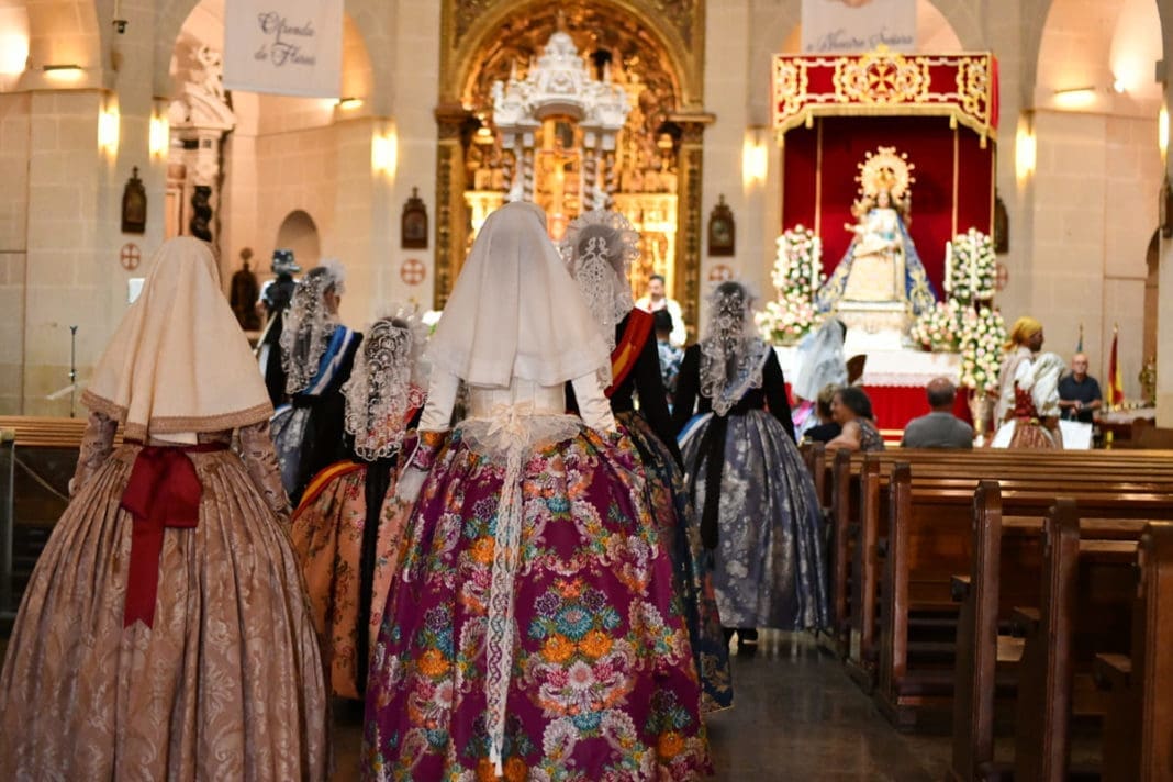 El mundo de la fiesta ha rendido homenaje a la Patrona de Alicante, la Virgen del Remedio, en el 25 Aniversario de su Coronación con un tapiz alegórico a esa efeméride con rosas blancas en el cuerpo y rojas en las figuras.