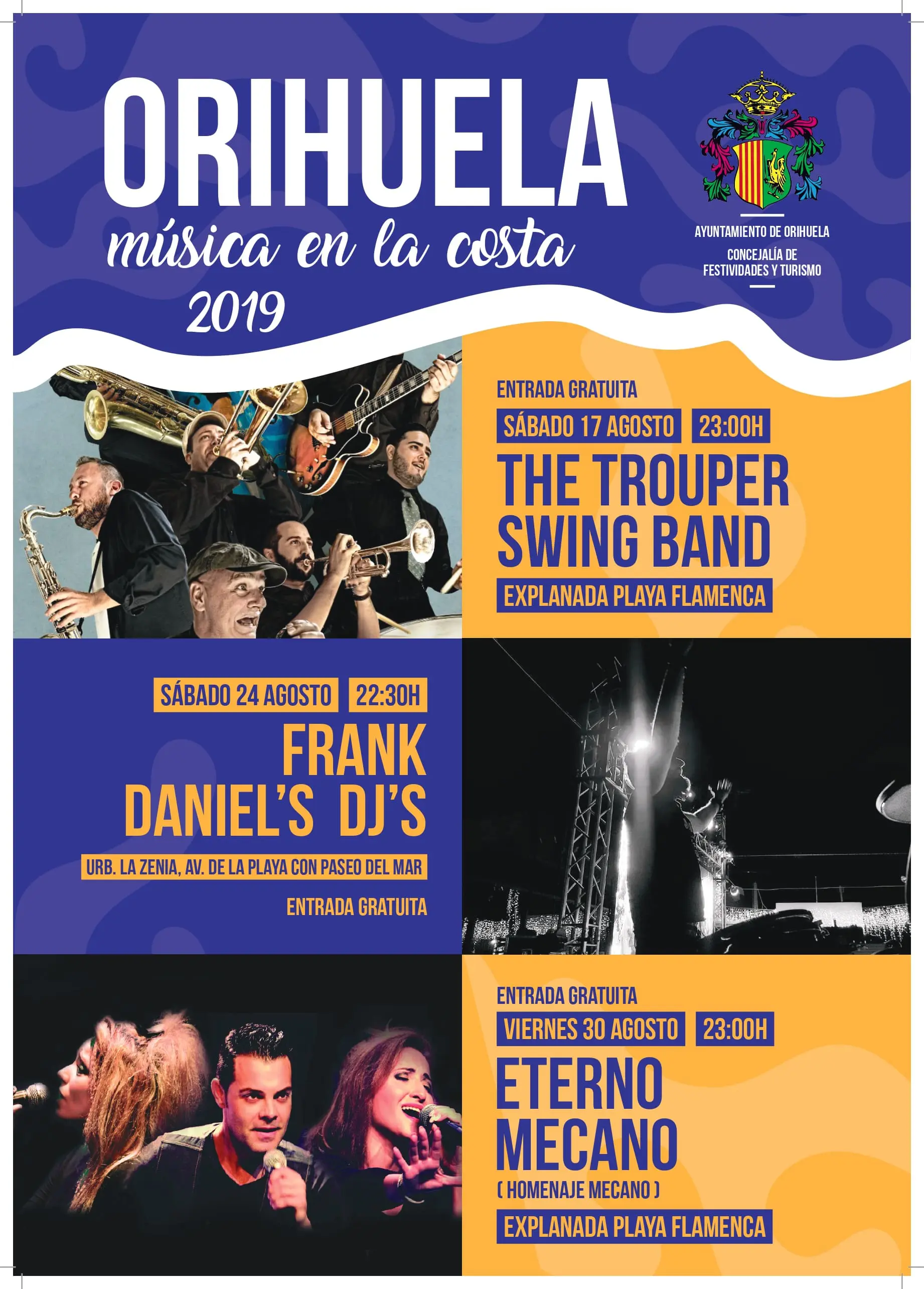 ‘Orihuela, música en la costa 2019’, es un evento que abarca una serie de conciertos en Playa Flamenca y en La Zenia los días 17, 24 y 30 de agosto. Tras la actuación de ‘The Trouper Swing Band’ el día 17 y la actuación de ‘Frank Daniel’s DJ’s’ el próximo sábado, cerrará este festival ‘Eterno Mecano (Homenaje Mecano)’ el viernes 30 de agosto, a las 23:00 h., en la la Calle de las Orquídeas, en la explanada de Playa Flamenca.