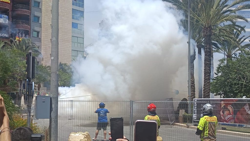La habitual potencia en las mascletàs de Fuegos Artificiales del Mediterráneo ha comenzado a vislumbrarse con la inicial traca valenciana, a la que han seguido cuatro fases de fuego aéreo en combinación con efectos de distinta sonoridad. Después de un golpe que ha cerrado esta fase aérea, han comenzado cinco fases terrestres compuestas por truenos de hasta seis calibres diferentes, en sintonía con efectos de acompañamiento de fuego aéreo y detalles de truenos potentes en disparo de morteros terrestres.