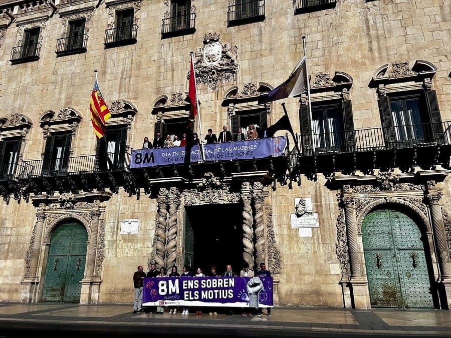 Los grupos municipales del Ayuntamiento de Alicante han escenificado una imagen de división por el Día Internacional de la Mujer al desplegar el equipo de Gobierno la pancarta oficial conmemorativa del 8M en el balcón consistorial mientras a la puerta del edificio, las formaciones de izquierda han sostenido otra con el lema acuñado por las organizaciones feministas. Por su parte, VOX no se ha sumado a la cita.