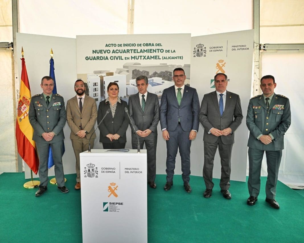 Pistoletazo de salida, al menos de manera oficial, a las obras del nuevo acuartelamiento de la Guardia Civil en Mutxamel. Este martes, el director general de la Guardia Civil, Leonardo Marcos, ha visitado el solar en la antigua cochera de tranvías, en la avenida de Alicante, 34, donde ya se están ejecutando los trabajos para la construcción de los dos edificios. Junto a él, el subdelegado del Gobierno, Juan Antonio Nieves, la presidenta de la Sociedad de Infraestructuras y Equipamientos Penitenciarios y de la Seguridad del Estado (SIEPSE), Mercedes Gallizo, y los dos alcaldes a los que presta servicio, el de Mutxamel, Rafael García Berenguer, y el de Sant Joan d’Alacant, Santiago Román.
