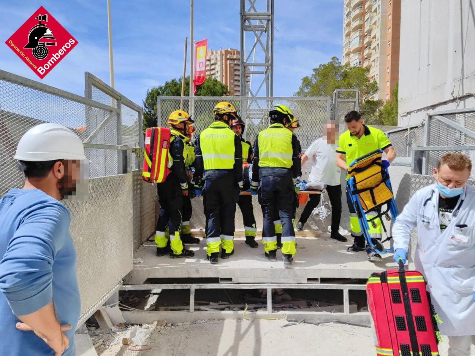 Según fuentes del Consorcio Provincial de Bomberos, a las 13:22 horas se ha realizado la extracción de un hombre herido en una obra ubicada en la calle Presidente Adolfo Suarez de Benidorm.