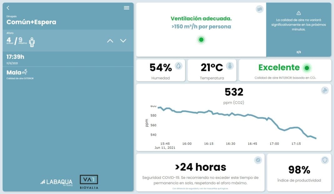 Con Air Sentinel, que se está instalado progresivamente en las oficinas de Hidraqua y sus empresas participadas en la Comunitat Valenciana y continuará durante los próximos meses, se consigue controlar parámetros ambientales como CO2, temperatura y humedad relativa en aire interior con un medidor totalmente seguro al estar certificado por ENAC, actuando como indicadores de la ventilación y la calidad del aire. Cruzando esta información con datos de aforo instantáneo de la oficina y mediante el uso de algoritmos de Inteligencia artificial y machine learning, la aplicación, de forma instantánea e intuitiva, es capaz de informar sobre el estado del aire de la oficina. Toda la información y análisis realizados es recopilada y enviada a un servidor, pudiendo ser visualizada a través de una web interactiva.