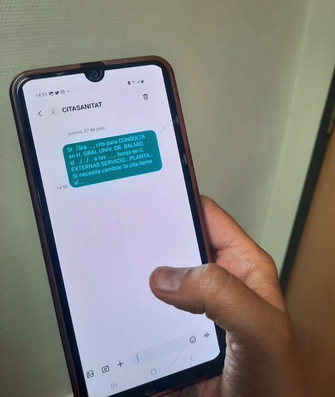 El mensaje que recibe el paciente en su móvil consta de la inicial del nombre y el primer apellido de la persona citada, seguida del día, hora, servicio y lugar de citación.