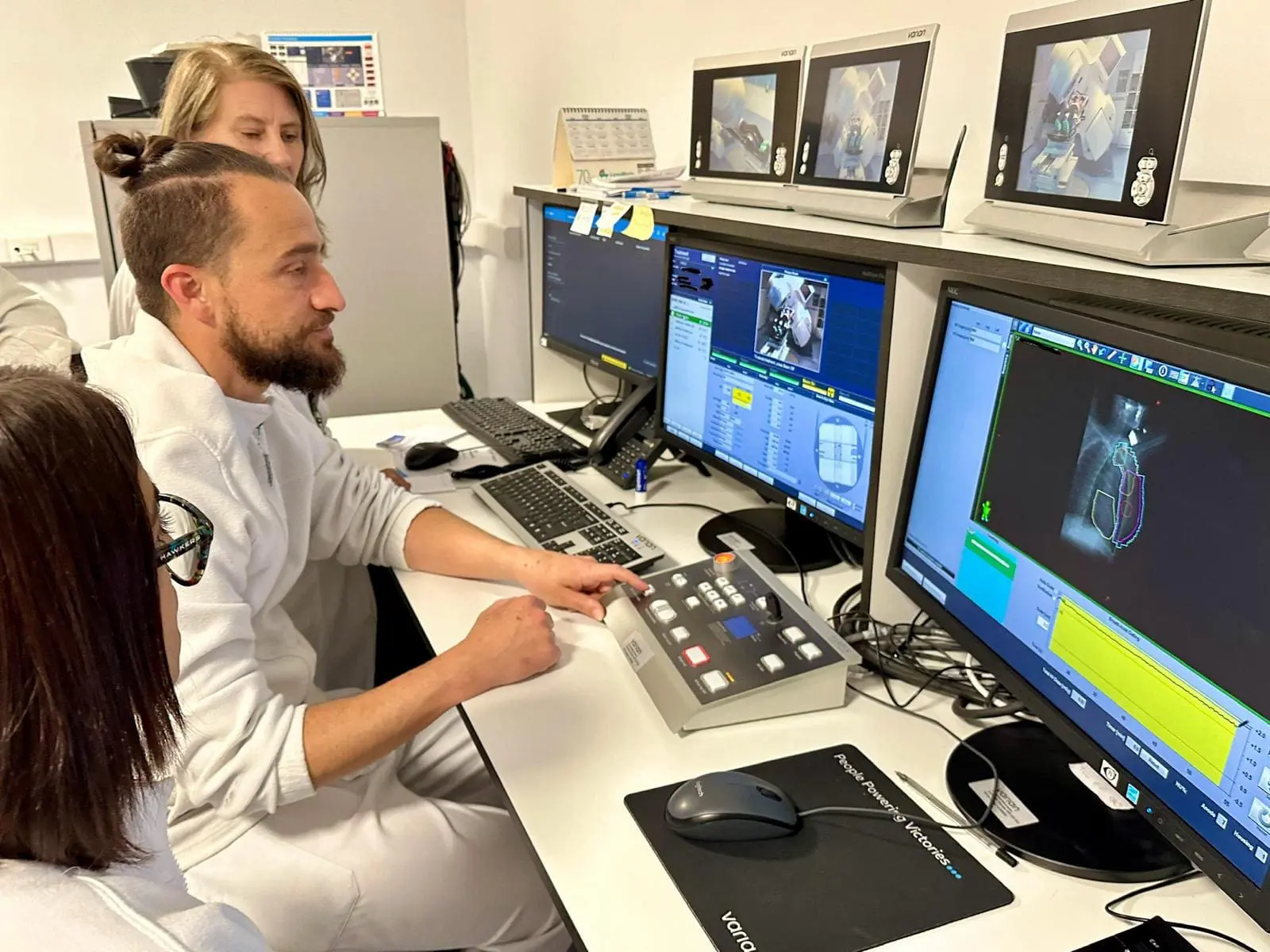 En el TAC, la paciente realiza inspiraciones y mantiene la respiración un tiempo, quedando todo registrado en el equipo: el ritmo de las inspiraciones, el tiempo que mantiene la respiración etc. Con ese registro, los miembros del servicio de Radiofísica diseñan el tratamiento personalizado que se llevará a cabo en el acelerador.