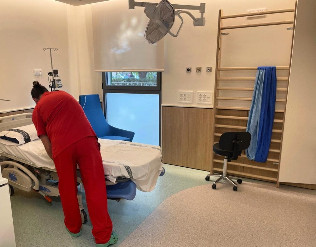 Asimismo, los paritorios tienen espalderas en las que las matronas colocarán elementos para agarrarse y hacer ejercicios hipopresivos, ya que la suspensión corporal facilita el expulsivo. Las camas de parto son ajustables, lo que permite a la mujer cambiar de posición fácilmente para aliviar el dolor, mejorar las posiciones de la cabeza del bebé y, en definitiva, realizar un proceso más fisiológico y cómodo.