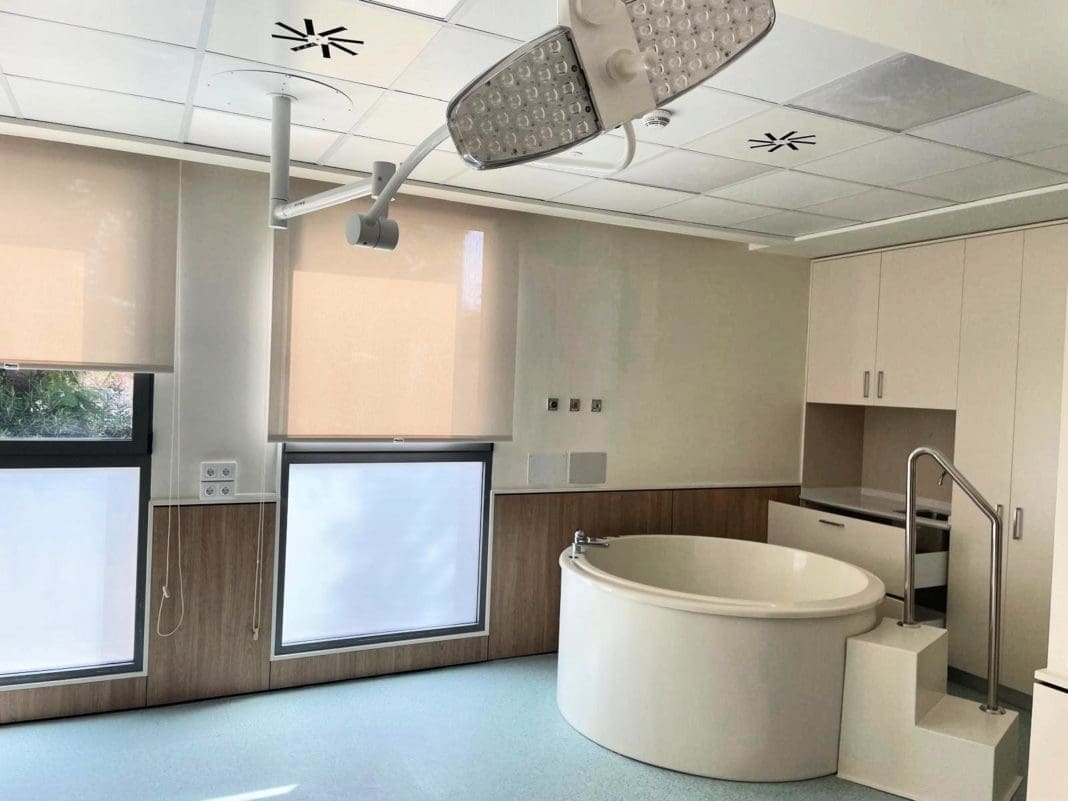 La remodelada unidad obstétrica está ubicada en la planta baja del hospital y consta de cuatro salas de nacimiento individuales y un nuevo quirófano integrado en estas mismas dependencias para atender las emergencias obstétricas. El quirófano está dotado de dos cunas neonatales, necesarias en caso de parto gemelar. Además, para ganar en seguridad, el suelo es conductivo y previene las descargas electrostáticas.
