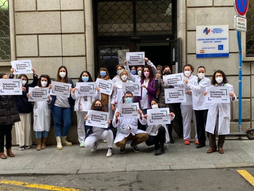 El personal sanitario se ha concentrado este jueves a las puertas de sus centros de salud bajo el lema “Salvemos la A Primaria” para exigir el compromiso de Sanitat