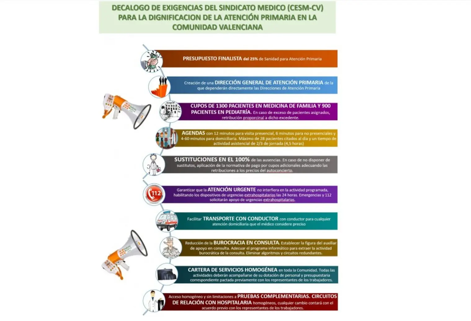 La Conselleria de Sanidad ha establecido que las Urgencias hospitalarias funcionarán como en un domingo, los centros de salud y consultorios auxiliares como un sábado y los centros de especialidades operarán solo con el 25% del personal para consultas preferentes. También se ha previsto una concentración de protesta a las 12:30 horas en la plaza de la Montañeta de Alicante, frente a la Subdelegación del Gobierno.