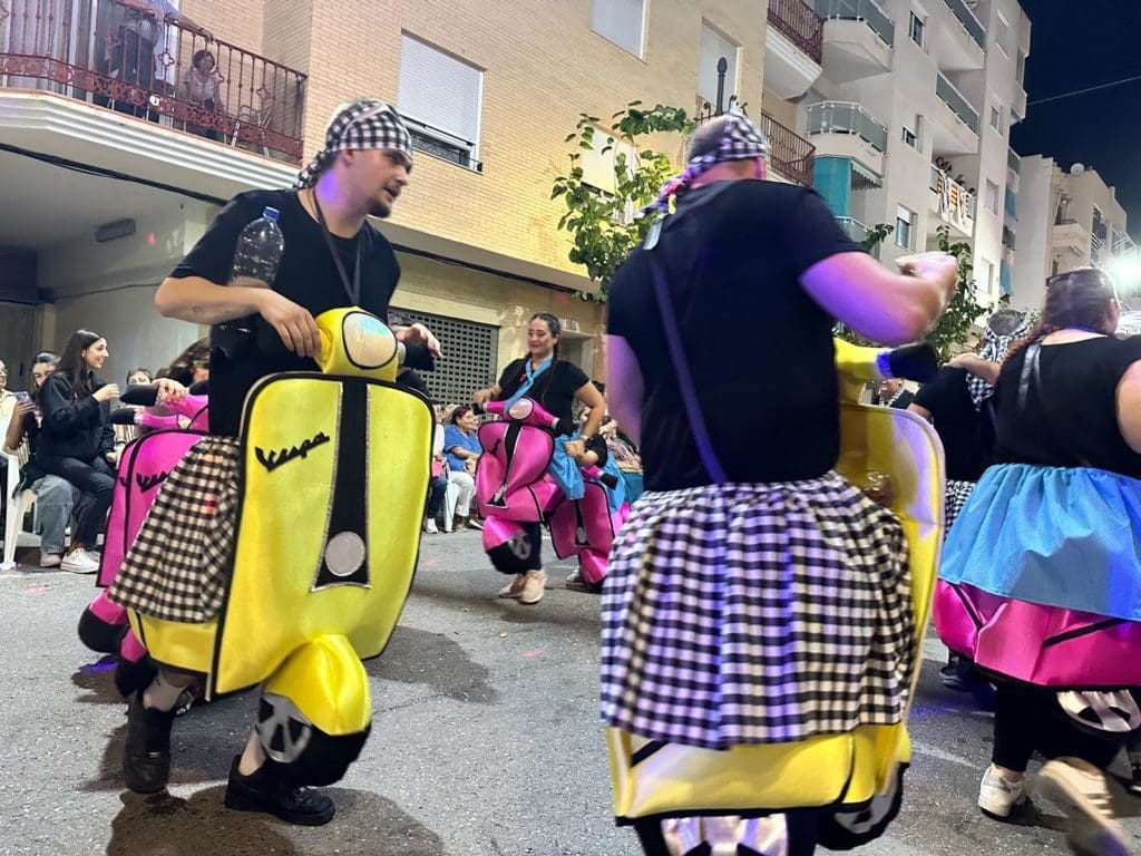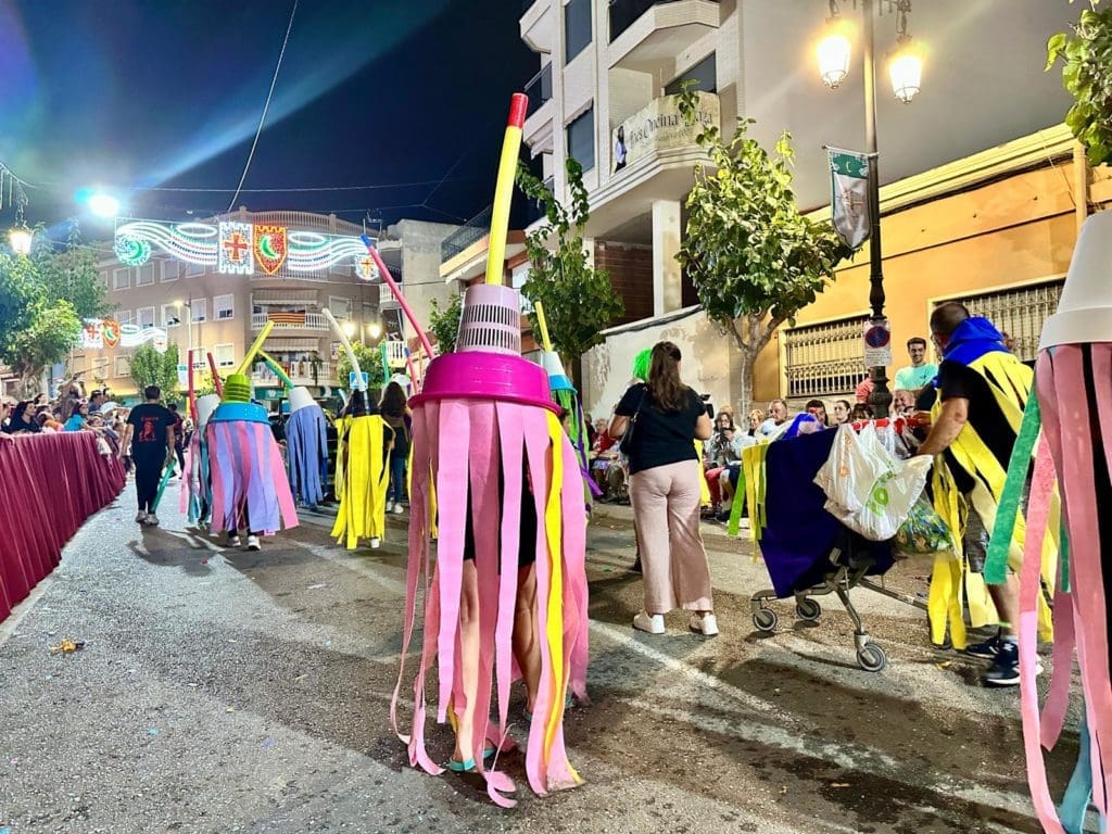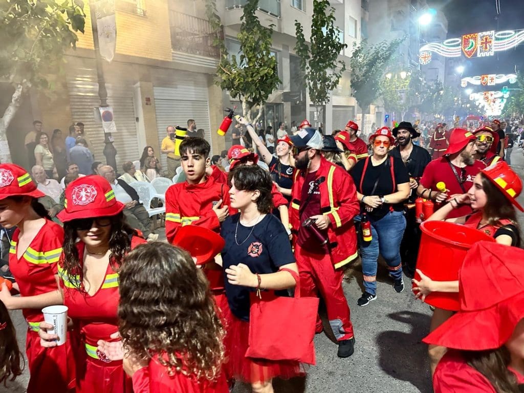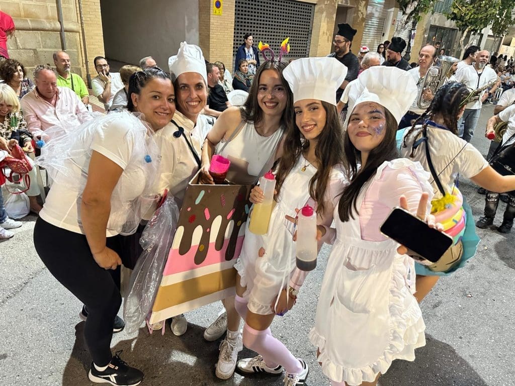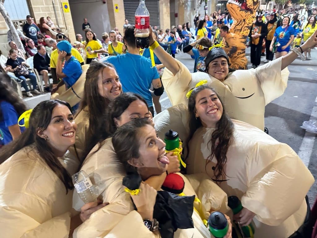 Con música enlatada desfilaron desde “Charlie y la máquina de chocolate” (Marrocs), que daba inicio a la retrata, fueron sucediéndose temáticas, como “Dioses griegos” (Ain Karim), “Bomberos (Pollosos), “Un paseíto en Vespa” (Cavallers de Conquesta), “Fregona” (Cavallers del Temple), “Sombies” (Tercio de Flandes), “Boxeo” (Cristians del Campello), “Tribu comanche” (Jaume I), “Olimpiadas” (Zairíes), “Srek” (Maseros), y “Locomía”, idea de Veterans.