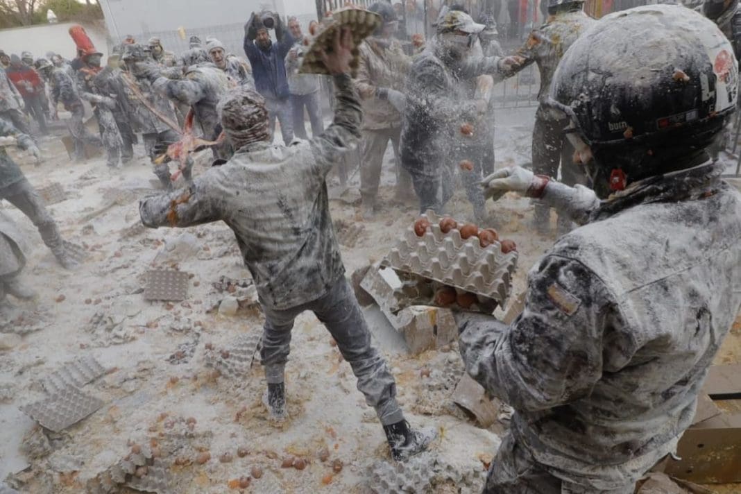 Este año, durante la ‘contienda’ se han empleado 600 kilos de harina de sobrantes de panificadoras, 12.000 huevos caducados y 100 kilos de pólvora, según ha confirmado a EFE el alcalde de la localidad, Sergio Carrasco.