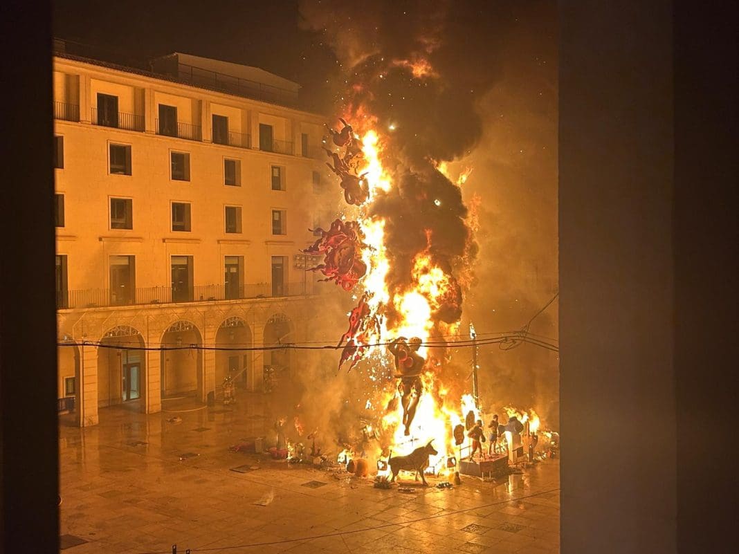 A partir del simbólico disparo de la Palmera y tras consumir el fuego las oficiales, Alicante ha comenzado a arder por los cuatro costados con la cremà de las 234 hogueras adultas e infantiles y las 50 portadas de barracas, repartidas por todos los distritos.