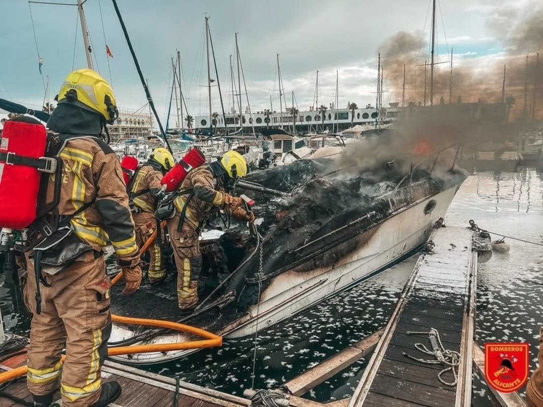 Efectivos de los bomberos del Servicio de Prevención y Extinción de Incendios y Salvamento de Alicante (Speis) han intervenido este miércoles en un incendio que ha calcinado un barco en el Puerto de la ciudad, después de que se hubiera producido una explosión en el motor.