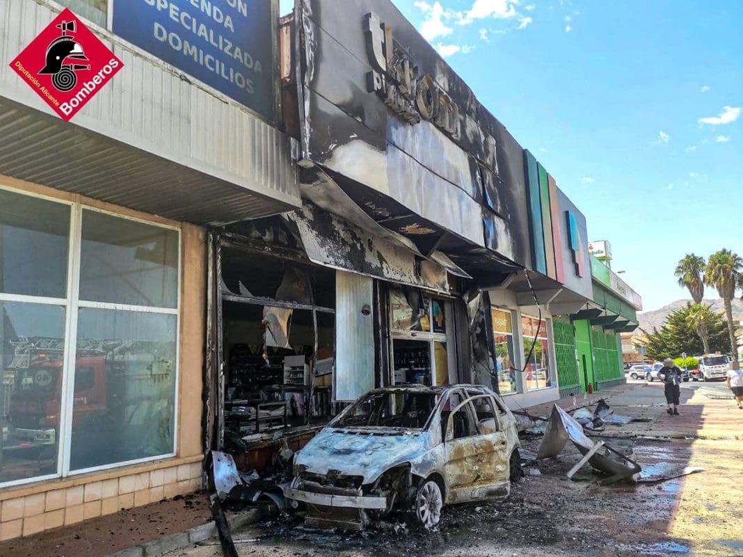 ‘Aparatoso’ incendio de un coche en la puerta de un almacén de pinturas de Orihuela