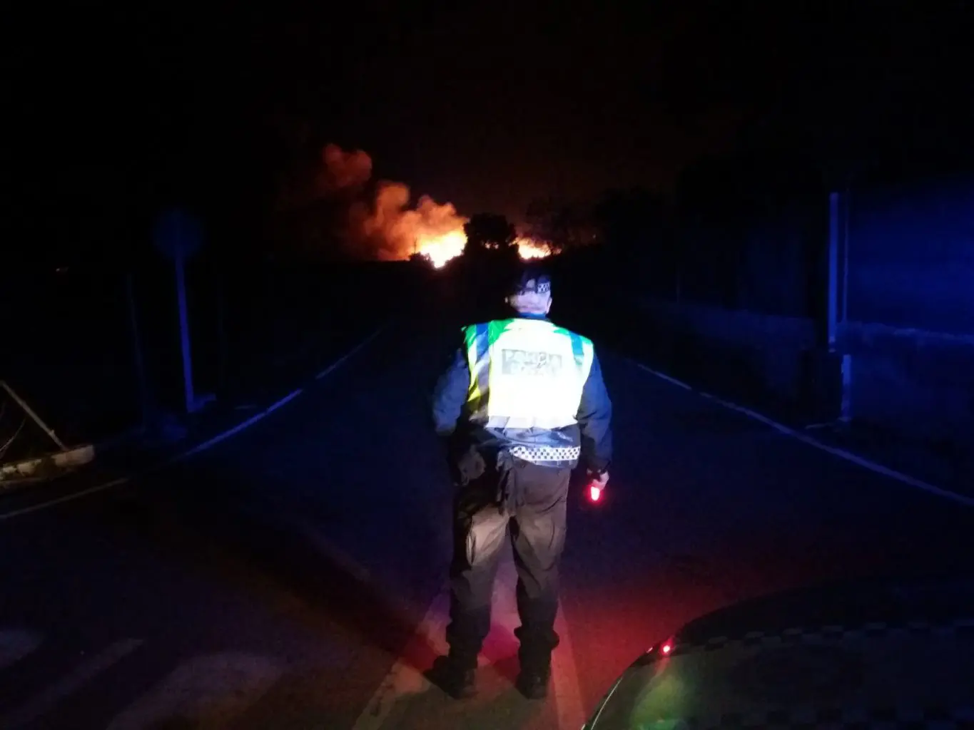 Patrullas de la Policía Local de Elche colaboraron anoche con los equipos de Emergencias que se desplazaron para llevar a cabo los trabajos de extinción y control del incendio de una fábrica de palets ubicado en la pedanía ilicitana de La Marina.