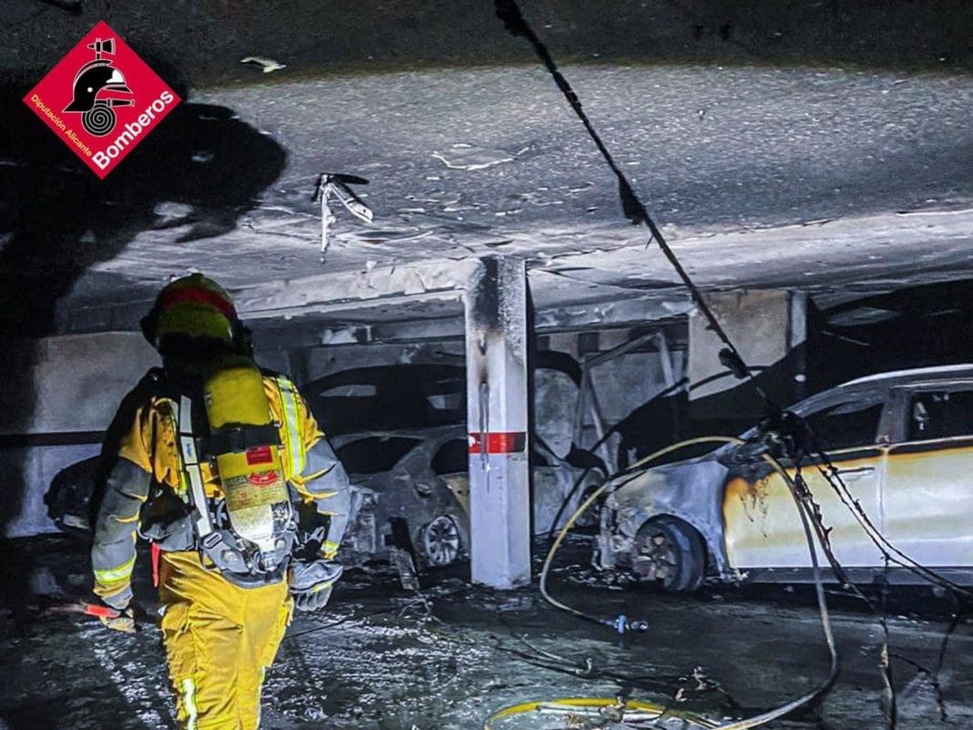 Efectivos de bomberos han sofocado un incendio en el garaje de unos edificios en Benidorm, que ha calcinado un total de cuatro vehículos y ha inundado de humo y gases tóxicos varias plantas subterráneas del inmueble.