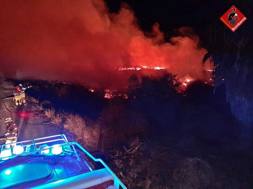 Un incendio declarado en la partida de Puçol, cerca del parque natural del Hondo, afectó anoche a tres hectáreas de palmeras.