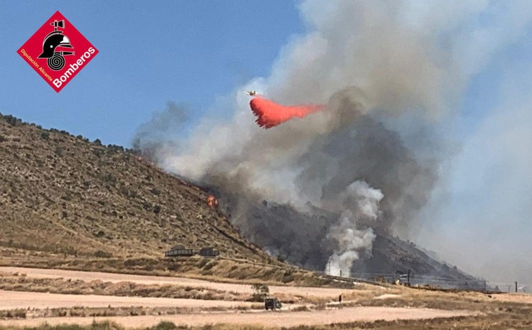 El incendio forestal declarado este sábado en la pedanía de La Encina, en el término de Villena (Alicante), y que afecta a territorio de Castilla-La Mancha, sigue activo. Los bomberos trabajan desde primera hora de este domingo en un rebrote del fuego.
