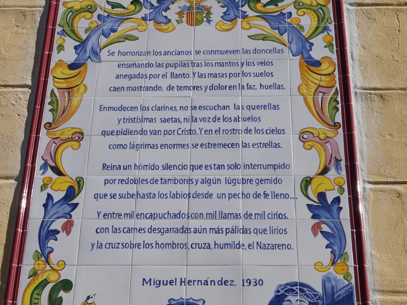 Esta mañana se ha instalado de manera definitiva el mosaico enmarcado de 54 azulejos con el soneto de Miguel Hernández “El Nazareno”, dedicado a la figura de Nuestro Padre Jesús, patrón de la localidad.