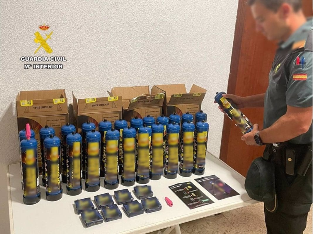 La Guardia Civil ha investigado a un joven español de 22 años por un presunto delito contra la salud pública, tras ser interceptado en la localidad de Jávea con 24 botellas de gas de óxido nitroso, conocido popularmente como «gas de la risa».