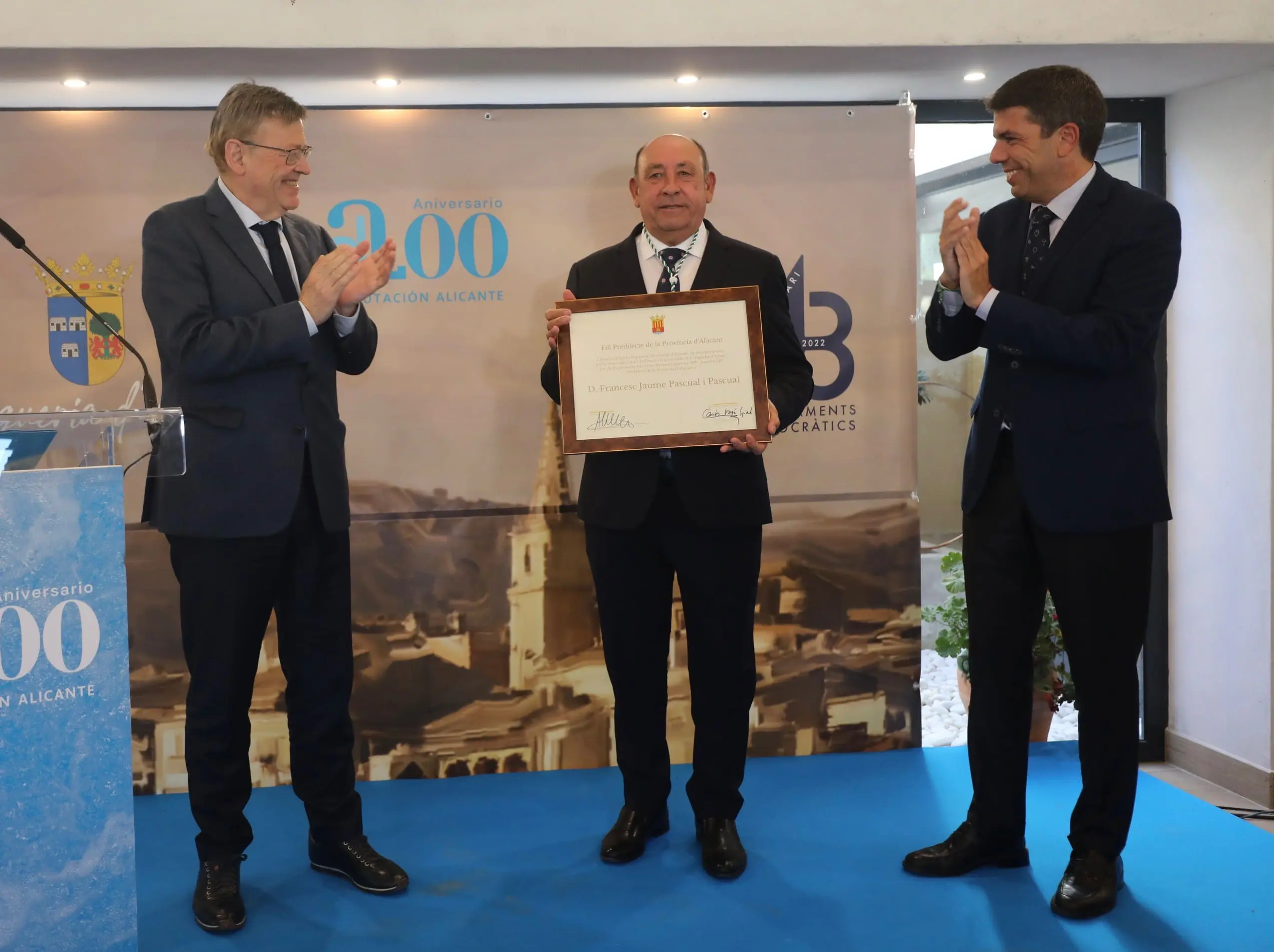 El presidente de la Diputación de Alicante, Carlos Mazón, entregó este sábado la medalla de reconocimiento como Hijo Predilecto de la Provincia al alcalde de L’Alquería d’Asnar, Jaume Pascual, en un acto celebrado en este municipio, del que es primer edil desde hace más de 43 años, lo que lo convierte en uno de los más veteranos de la provincia.