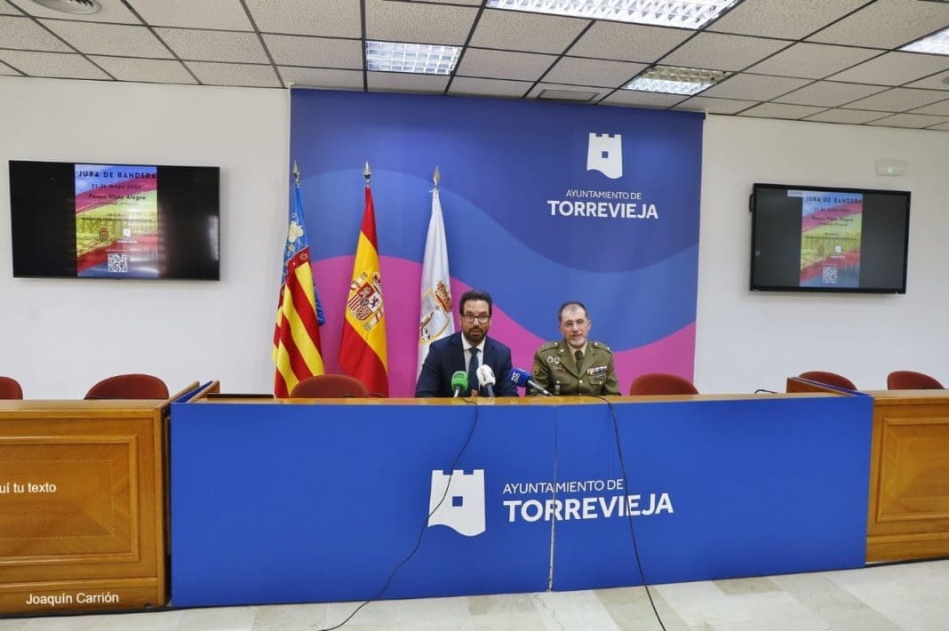 El concejal de Seguridad y Emergencias del Ayuntamiento de Torrevieja, Federico Alarcón, junto con el jefe de Comunicaciones del MOE, el comandante Alfonso Blas López, han presentado en el acto de Jura de Bandera para personal civil que se celebrará el próximo sábado, 21 de mayo, a las 12:00 horas, en el Paseo Vista Alegre.