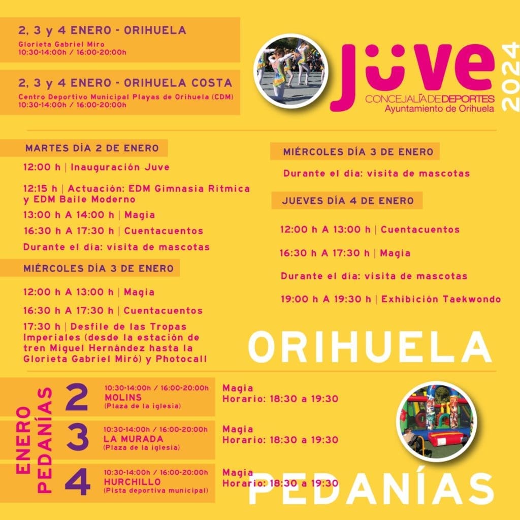 La inauguración de JUVE 2024 tendrá lugar el martes 2 de enero, a las 12:00h, en la Glorieta Gabriel Miró, con la primera de las actuaciones, a las 12:15h a cargo de las Escuelas Deportivas Municipales de Gimnasia Rítmica y Baile Moderno.