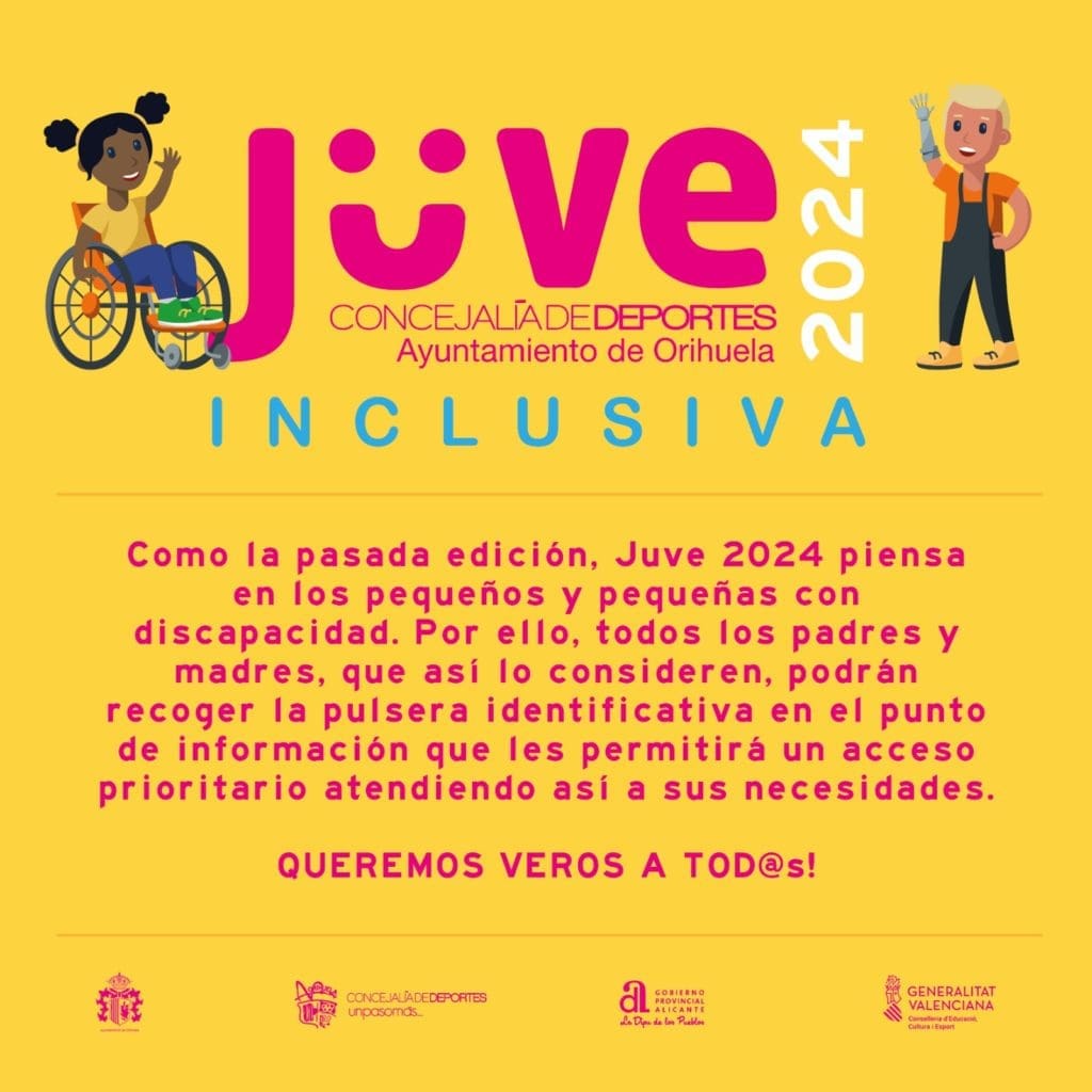 El concejal de Deportes ha destacado la iniciativa JUVE INCLUSIVA para que puedan participar todos los niños y niñas. Se instalará un punto de información junto a la zona de sonido, donde se facilitarán (previa acreditación de la discapacidad de los participantes) unas pulseras con el fin de minorar los tiempos de espera en las actividades y las atracciones.