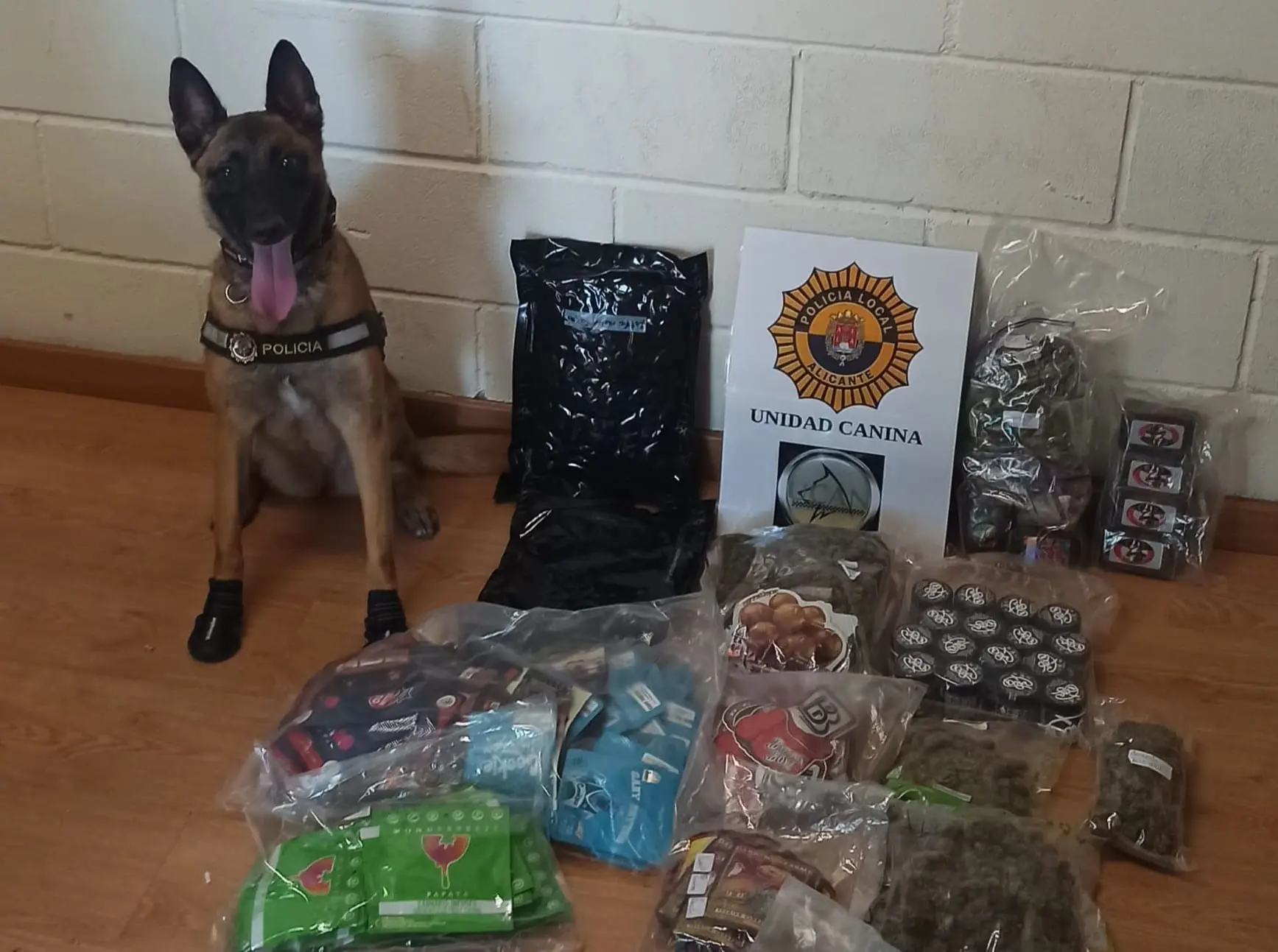 La unidad canina de la Policía Local ha detenido este fin de semana en la estación de autobuses de Alicante a un joven alemán de 20 años por un presunto delito contra la salud pública al intervenirle en su equipaje 5,51 kilos de hachís y marihuana en diferentes presentaciones, la mayoría en sobres monodosis con colores y motivos de animales, así como gominolas de cannabis, listos para su venta. Una vez más, la intervención de la perra Kata, adiestrada para la detección de sustancias estupefacientes, ha resultado clave en esta intervención.