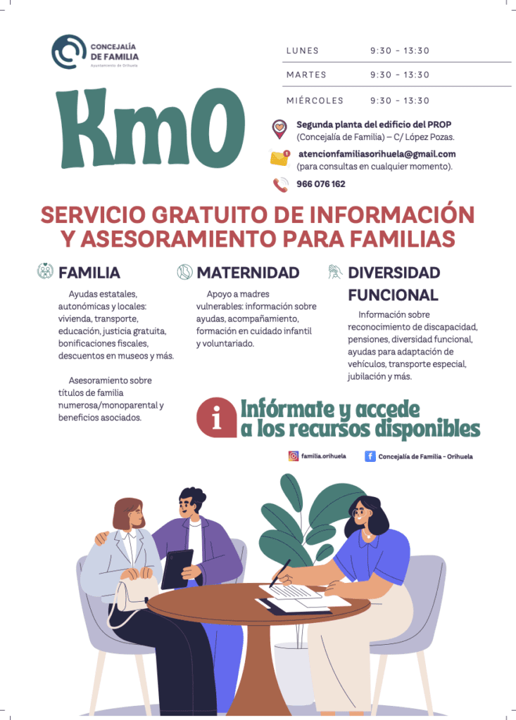 “Km0” ofrece su servicio presencialmente en las dependencias de la Concejalía de Familia ubicada en la segunda planta del edificio del PROP (C/ López Pozas), los lunes, martes y miércoles de 9:30 a 13:30. También se pueden realizar consultas por teléfono 96 607 61 62 o por correo electrónico atencionfamiliasorihuela@gmail.com.