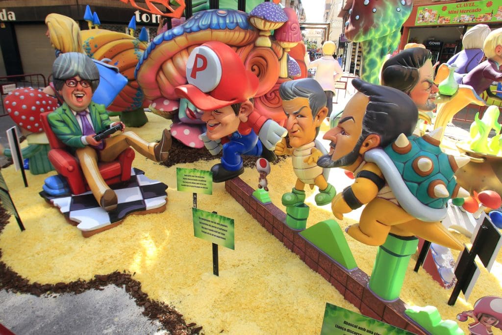 Un Carles Puigdemont riendo a carcajadas en un sofá manipulando un mando de Mario Bros. para mover a su antojo, al lado, a «Pedrito Bros.», Alberto Núñez Feijóo y a Santiago Abascal es una de las escenas más comentadas del monumento ‘Hongo’, de la comisión Doctor Bergez-Carolinas, donde junto a la leyenda «en España se vive de maravilla si no fuera por los corruptos que tenemos de gobernantes, que van a ver quien es el que más pilla».