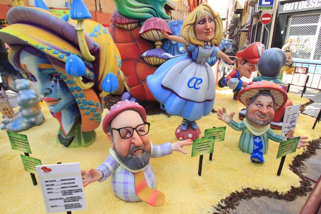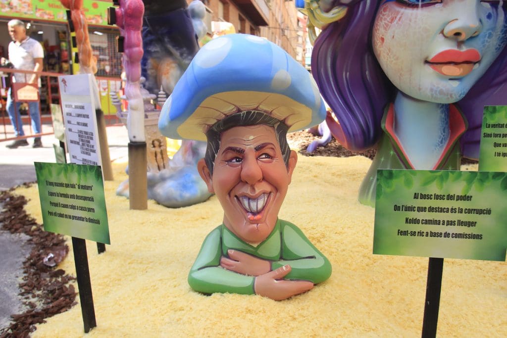 Junto a dos pequeñas setas con las fotos de Santos Cerdán y Leire Díez, un ninot de Koldo con el gesto torcido frente a otro de Ábalos sonriente acompañan a Begoña Gómez vestida de Alicia en el País de las Maravillas con el logo de AirEuropa en la falda.