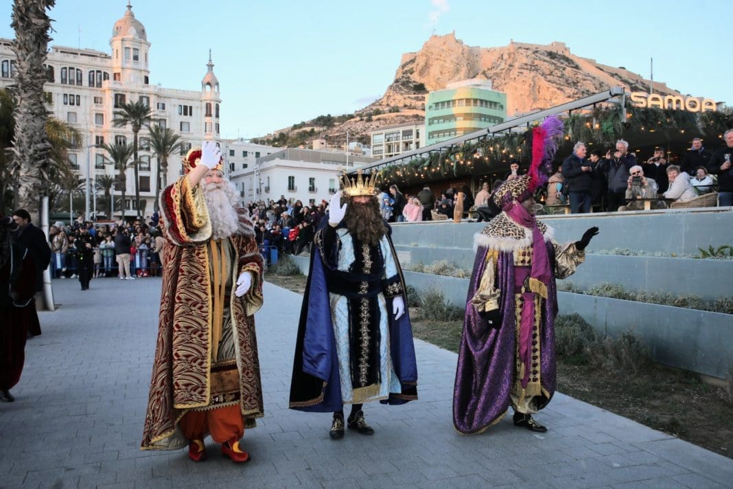 Más de 60.000 personas han abarrotado este viernes las calles del centro de Alicante para presenciar la Cabalgata de los Reyes Magos, que se ha desarrollado con brillantez, espectacularidad y ausencia de incidencias en medio de una expectación sin precedentes. La comitiva, integrada por 20 carrozas y unos 1.200 participantes, ha partido desde la avenida de la Estación poco después de las 19.00 y ha finalizado en la Plaza del Ayuntamiento unas dos horas después. Como preludio de la cabalgata, unas 4.000 personas han presenciado en vivo el saludo de Sus Majestades de Oriente en la Plaza de Toros, adonde se desplazaron tras desembarcar en Alicante en las Escaleritas de la Reina del puerto de Alicante ante unos 3.500 niños y mayores, que los vitorearon.