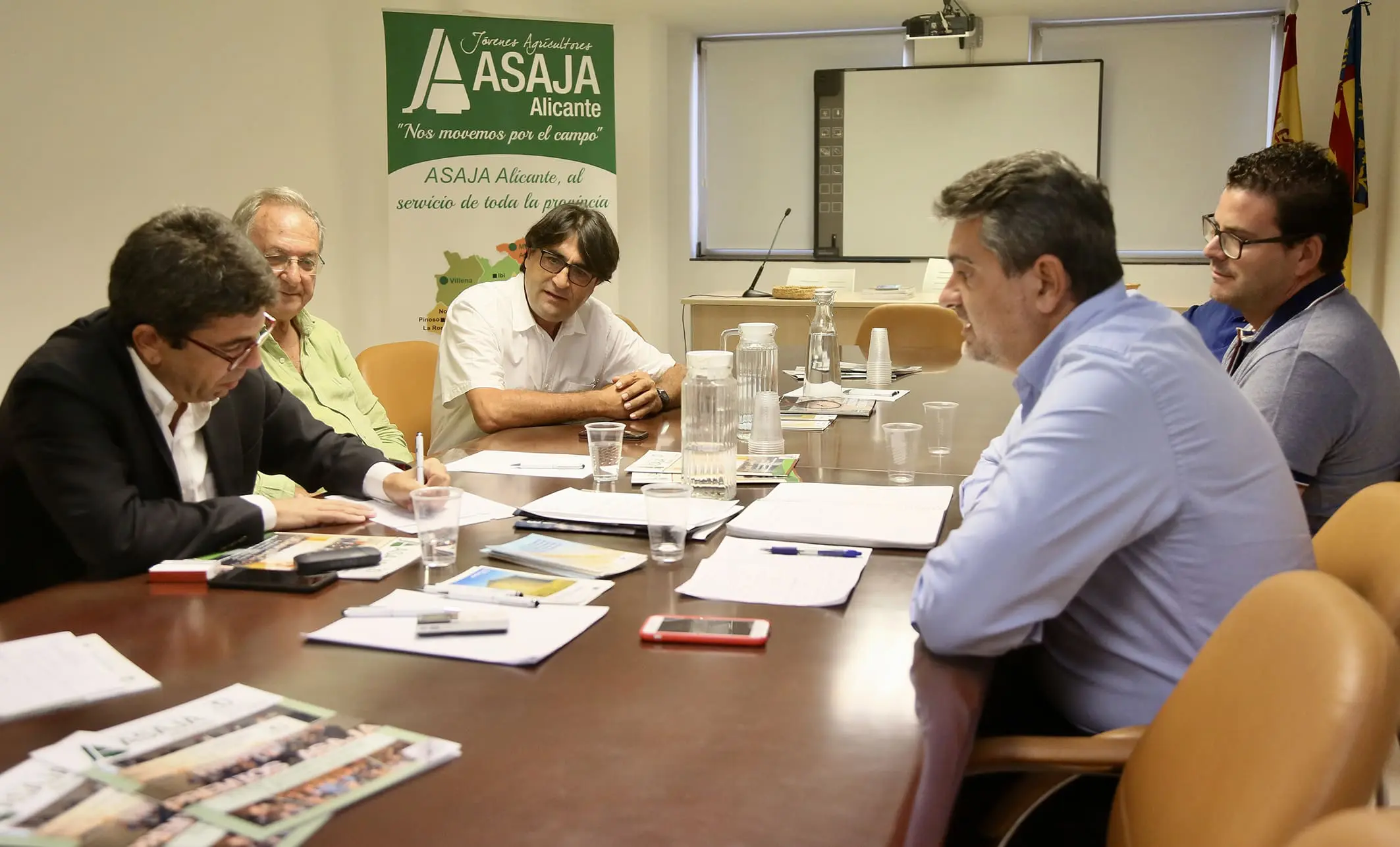 El presidente de la Diputación de Alicante, Carlos Mazón, se ha reunido esta mañana con el presidente de ASAJA, Eladio Aniorte, y con el presidente de ASAJA Orihuela, José Vicente Andreu, para abordar las solicitudes de ayudas directas, beneficios fiscales y medidas laborales que mitiguen los daños sufridos en las producciones agrícolas de la Vega Baja, tras los efectos de la DANA.