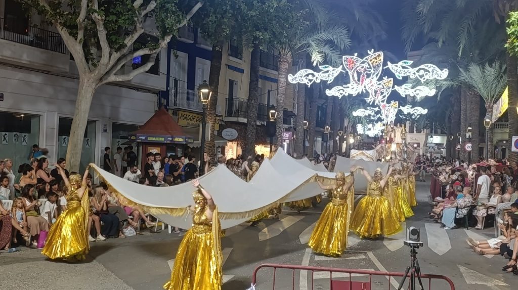 A las 20:30 horas de ayer, viernes, la fuente de la Calle Castelar ha sido el punto de encuentro de todas las comparsas, que 15 minutos después han iniciado su recorrido por las principales calles del municipio. El sonido de las marchas moras y cristianas, acompañado por vistosos trajes y coreografías, ha envuelto cada rincón de la localidad.