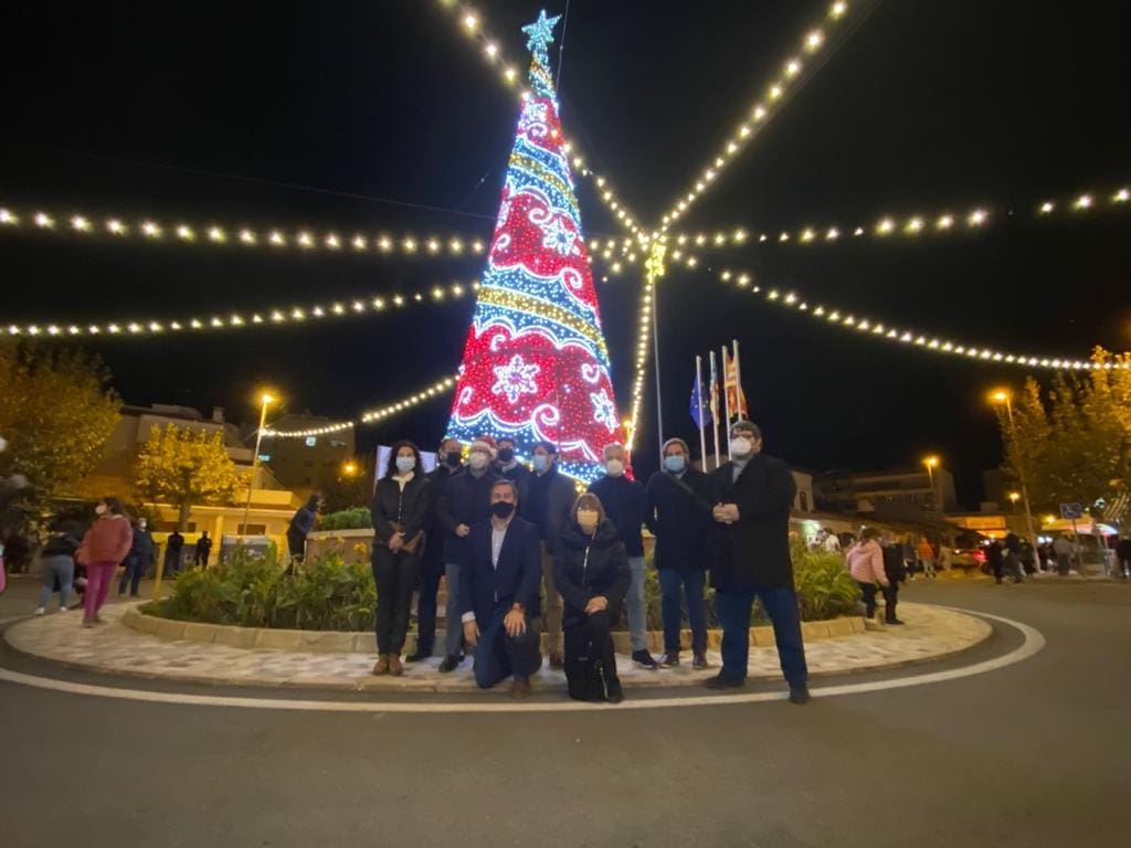 Anoche, a las 20:30 horas exactamente, el alcalde Juanjo Berenguer se encargó de accionar el botón con el que se inauguraba la iluminación callejera y el majestuoso árbol que ya preside la Plaza de la Constitución. Junto a él, el primer teniente de alcalde Julio Oca (Cs), el concejal de Fiestas y Tradiciones Cristian Palomares (PP), casi la totalidad de los concejales del equipo de gobierno que integran PP, Cs y Vox, y ediles de los grupos de la oposición, además de vecinos con residencia próxima a la zona y usuarios de la Casa de Cultura, que en esos momentos ofrecía obra de teatro.