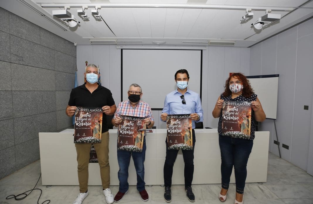 El alcalde de Torrevieja, Eduardo Dolón, acompañado por la concejal de Fiestas, Concha Sala, y el componente de la Cofradía de la Virgen del Rosario, Evaristo Perelló, ha presentado en el salón de actos del Ayuntamiento Periférico de La Mata las Fiestas Patronales en honor a la Virgen del Rosario 2020, que tendrán lugar del 1 al 7 de octubre.