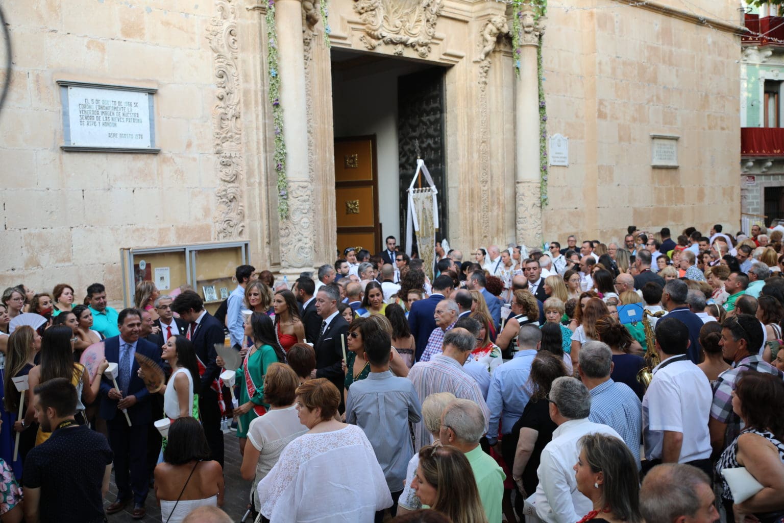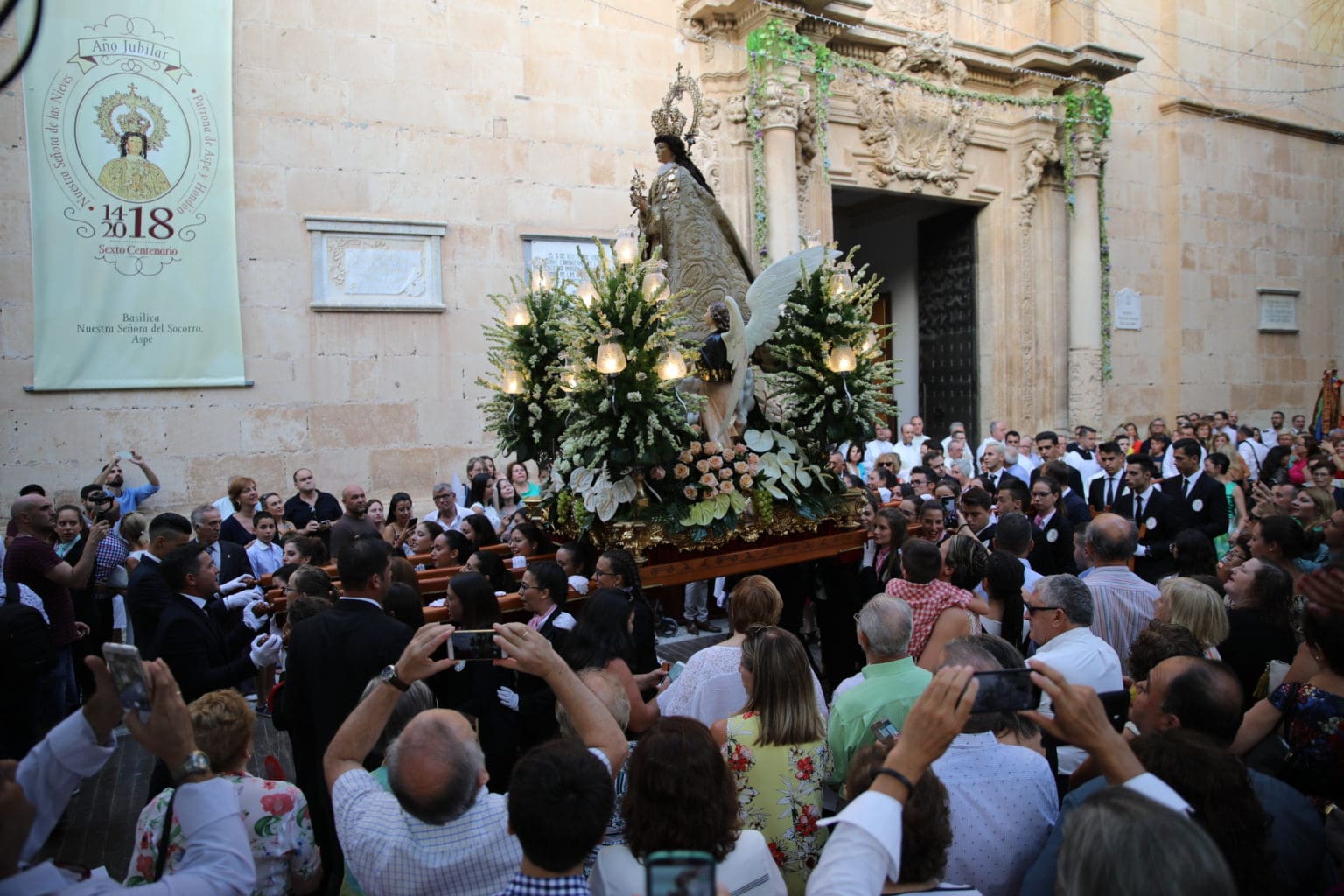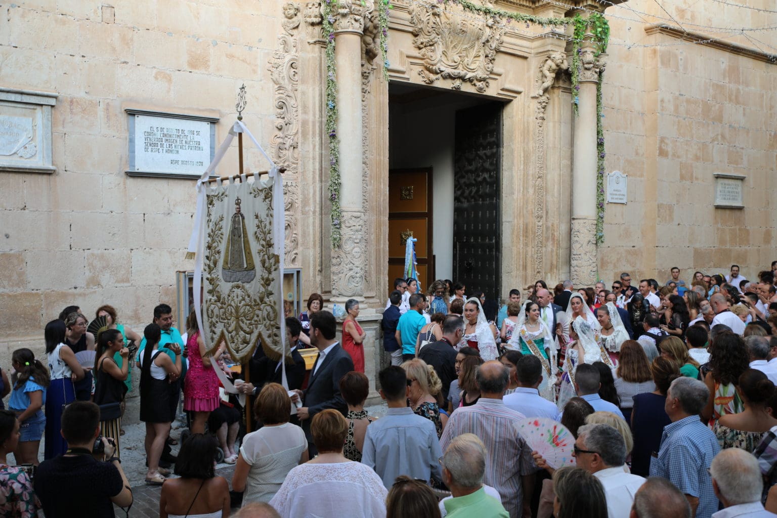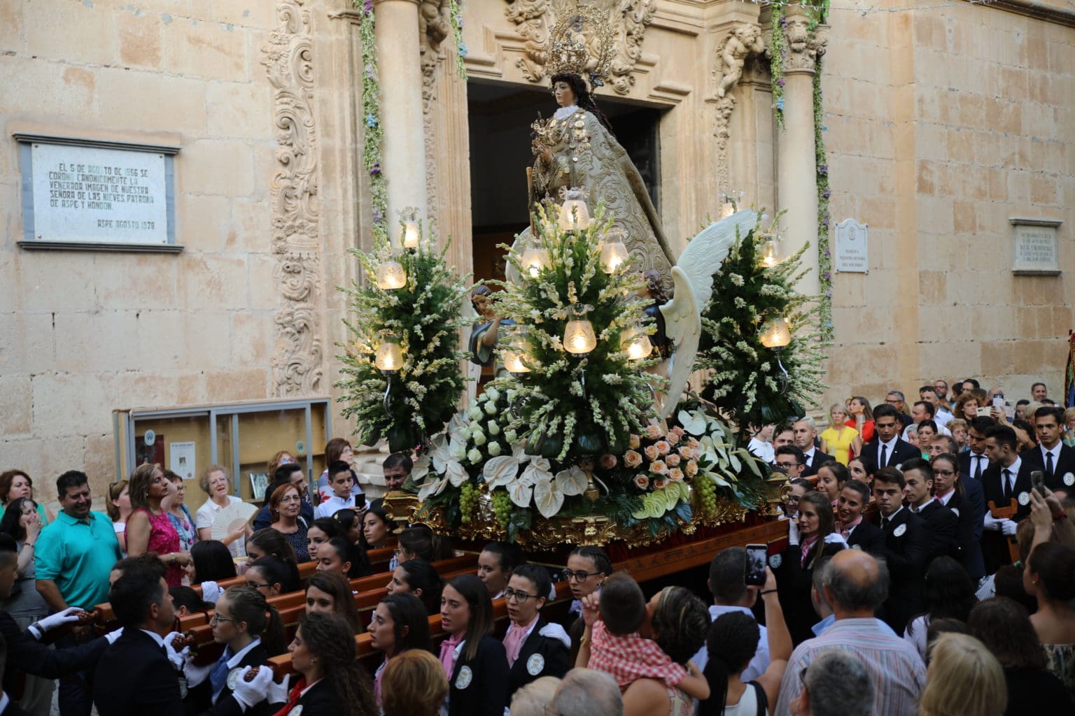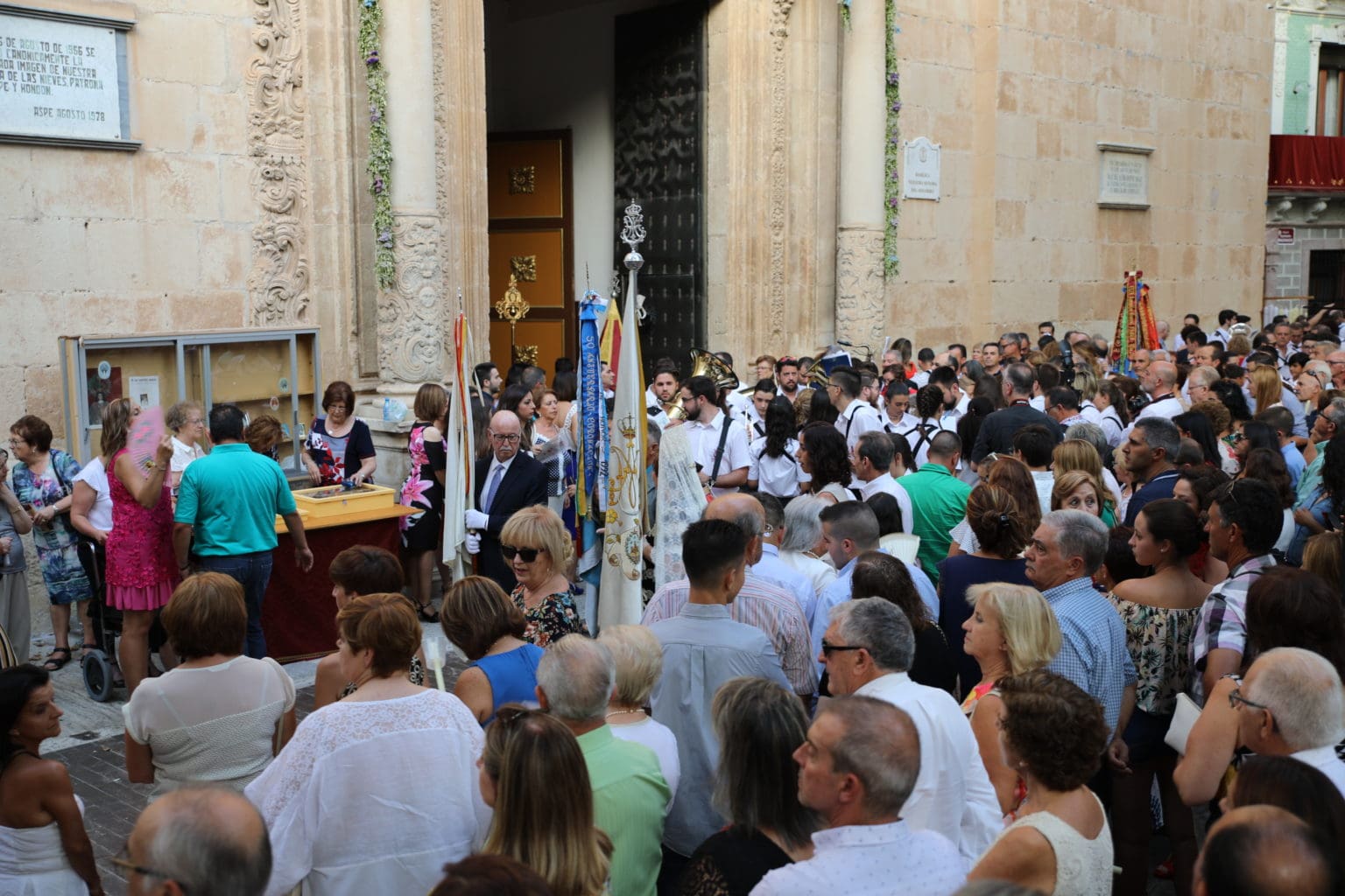 Las campanas de la Basílica de Nuestra Señora del Socorro de Aspe repiqueteaban con regocijo, eran las ocho y la luz del día no quería perderse la salida de la procesión de la patrona del municipio aspense. Los vecinos aprovechando el buen clima esperaban en las calles céntricas que la Virgen llegase hasta ellos para darle sus muestras de cariño. Aspe comparte patrona con el municipio de Hondón de las Nieves y los primeros en salir fueron la agrupación musical de La Serranica. Las Damas de Honor de Aspe y del Hondón de las Nieves, abanderados, festeros y fieles de la patrona acompañaban a la Virgen de las Nieves donde el colorido de los trajes tradicionales y de los porteadores del busto eran la tónica de una procesión que vecinos y curiosos deseaban verla pasar por su casco histórico. Los porteadores del busto, aproximadamente unos cien chicos y chicas que acaban de cumplir los dieciocho años, se turnaban durante el recorrido para llevar sobre sus hombros a su virgen. Las Damas de Honor con su ostentosa indumentaria iban delante de la virgen y detrás de la talla, el clero y autoridades civiles. A las diez de la noche, ante un plaza llena de aspenses y curiosos, se escucharon los cánticos en devoción a la talla de Nuestra Señora de las Nieves en el escenario de la plaza mayor.