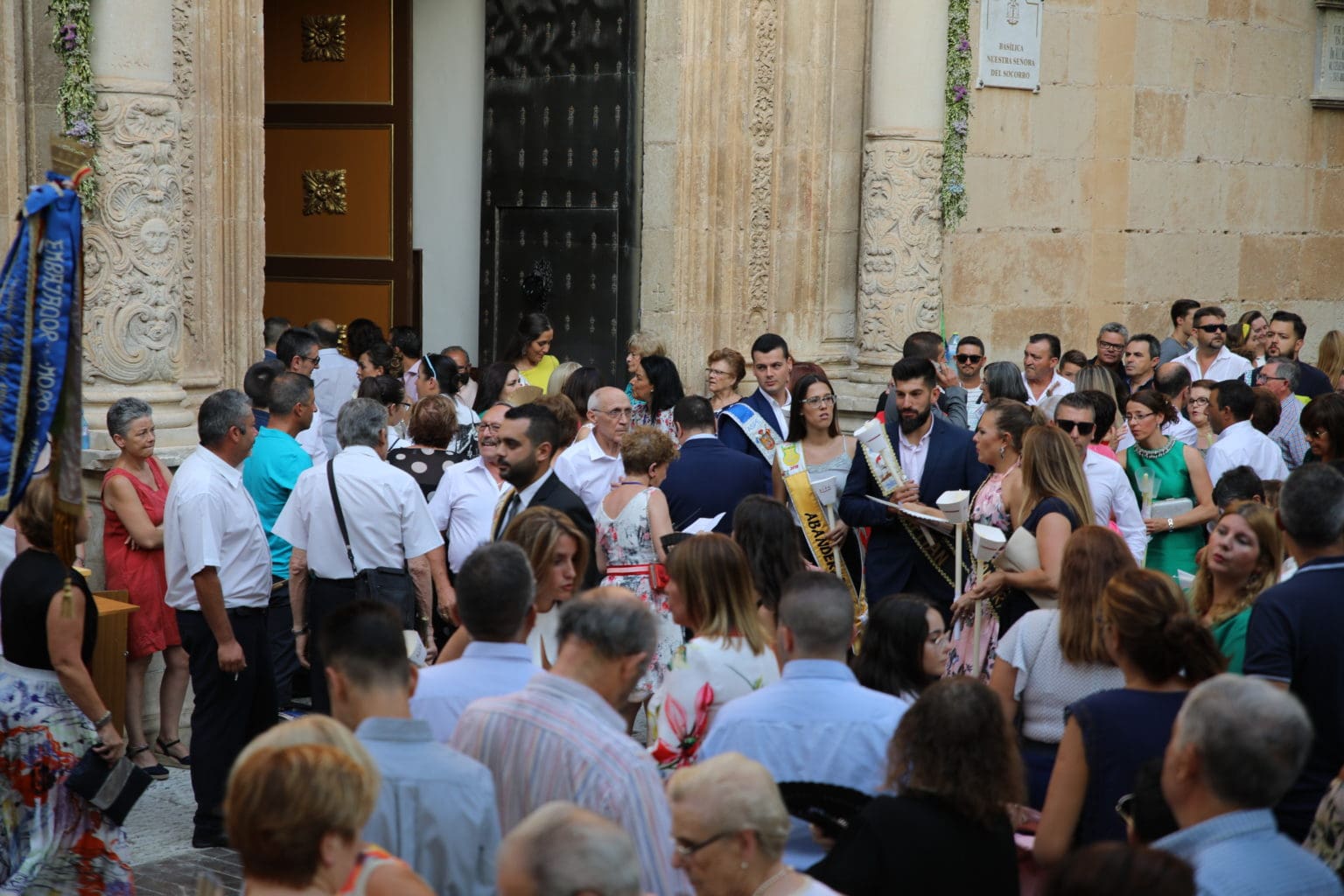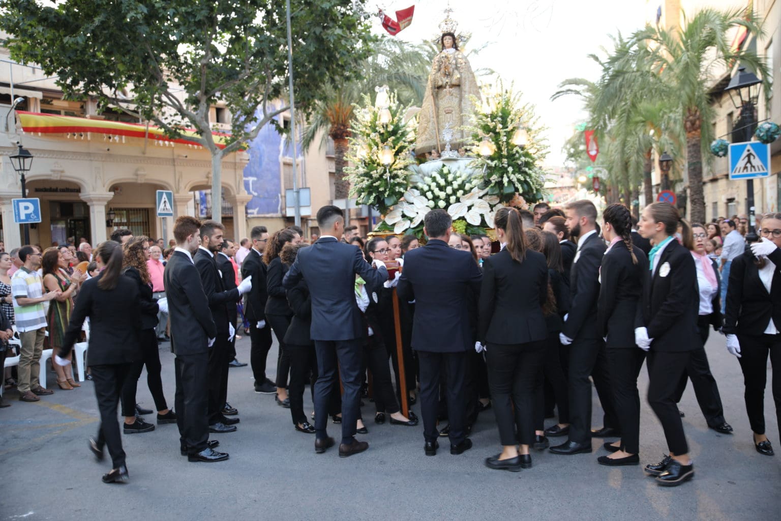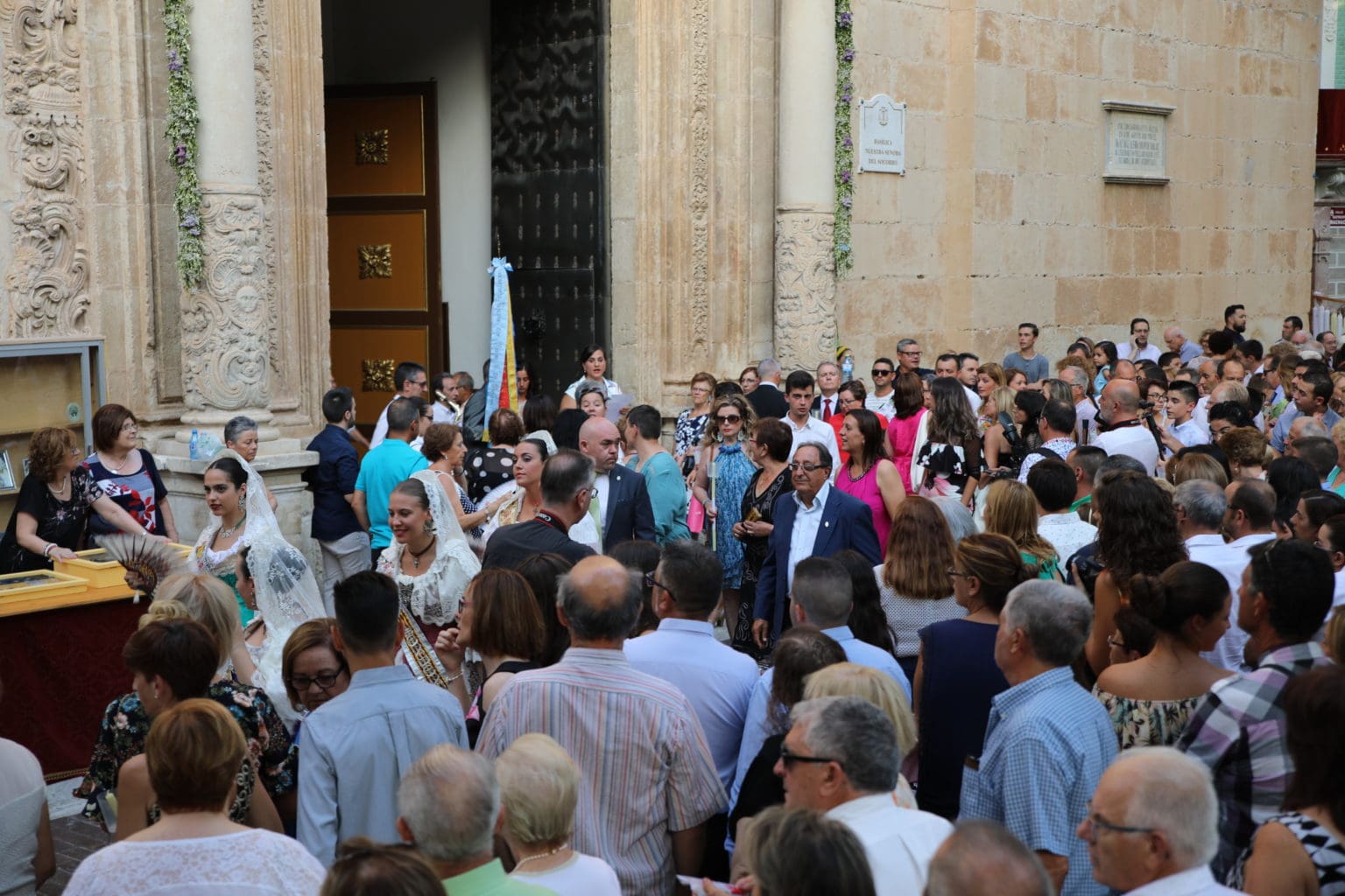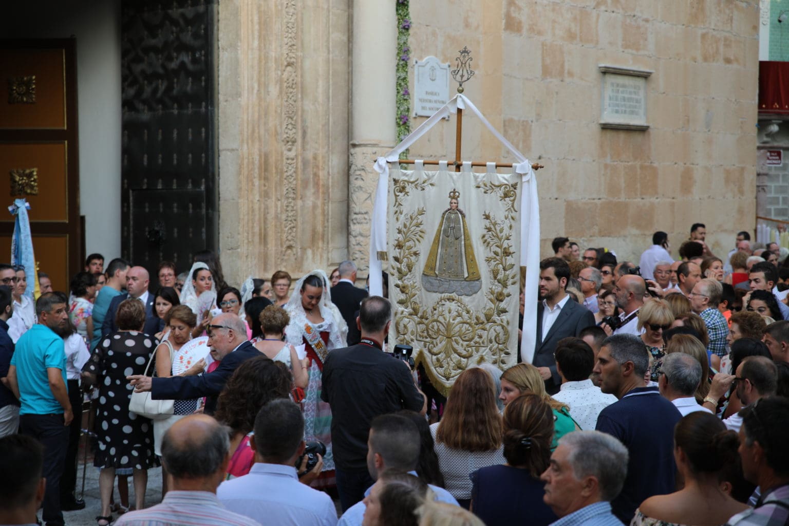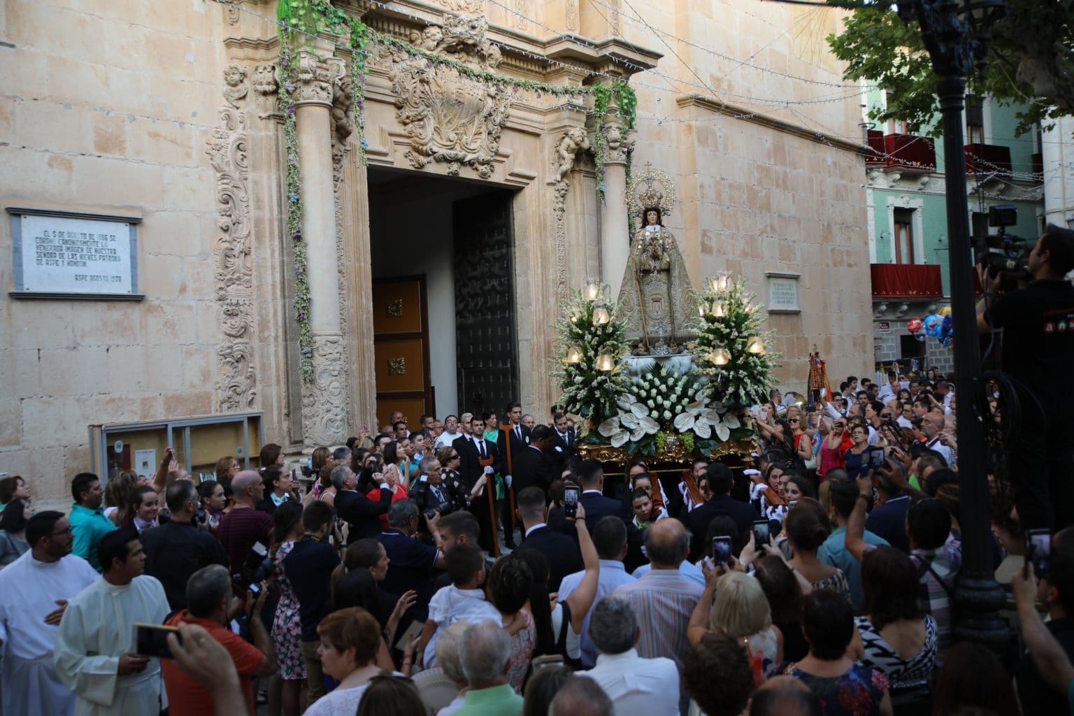 Las campanas de la Basílica de Nuestra Señora del Socorro de Aspe repiqueteaban con regocijo, eran las ocho y la luz del día no quería perderse la salida de la procesión de la patrona del municipio aspense. Los vecinos aprovechando el buen clima esperaban en las calles céntricas que la Virgen llegase hasta ellos para darle sus muestras de cariño. Aspe comparte patrona con el municipio de Hondón de las Nieves y los primeros en salir fueron la agrupación musical de La Serranica. Las Damas de Honor de Aspe y del Hondón de las Nieves, abanderados, festeros y fieles de la patrona acompañaban a la Virgen de las Nieves donde el colorido de los trajes tradicionales y de los porteadores del busto eran la tónica de una procesión que vecinos y curiosos deseaban verla pasar por su casco histórico. Los porteadores del busto, aproximadamente unos cien chicos y chicas que acaban de cumplir los dieciocho años, se turnaban durante el recorrido para llevar sobre sus hombros a su virgen. Las Damas de Honor con su ostentosa indumentaria iban delante de la virgen y detrás de la talla, el clero y autoridades civiles. A las diez de la noche, ante un plaza llena de aspenses y curiosos, se escucharon los cánticos en devoción a la talla de Nuestra Señora de las Nieves en el escenario de la plaza mayor.