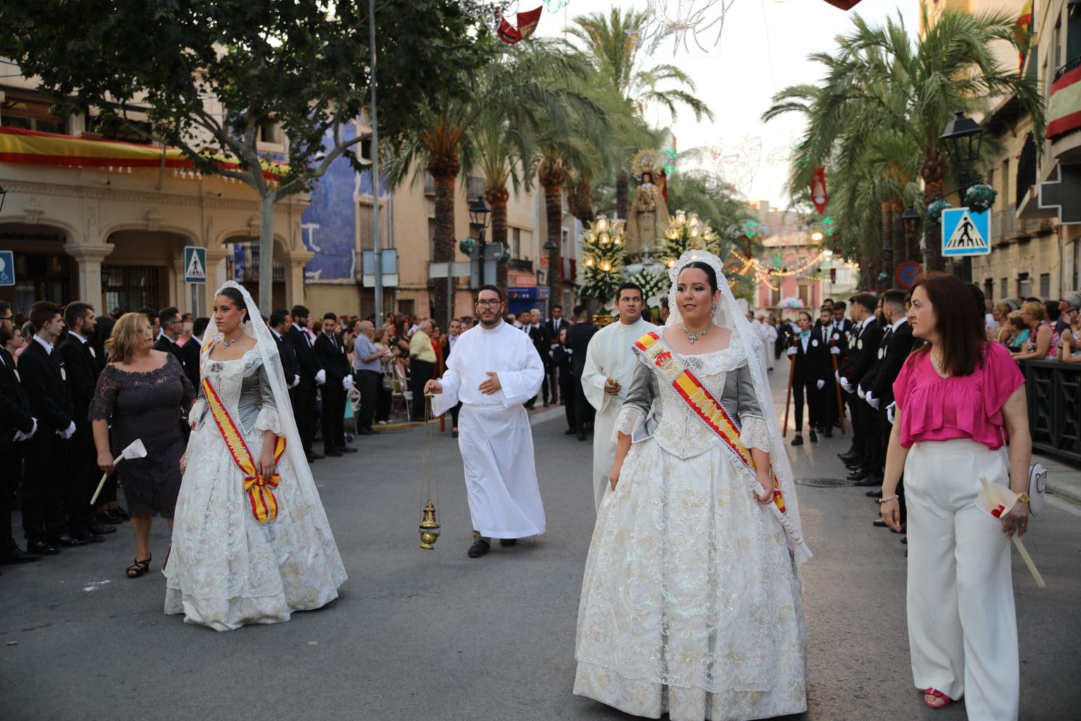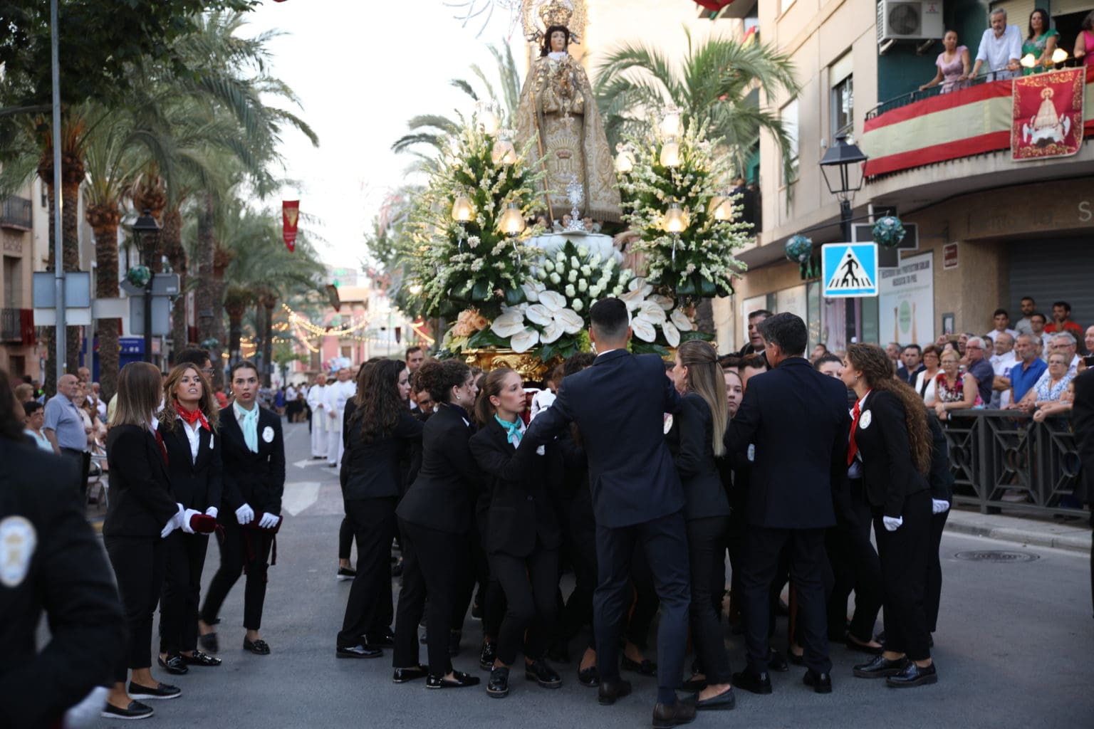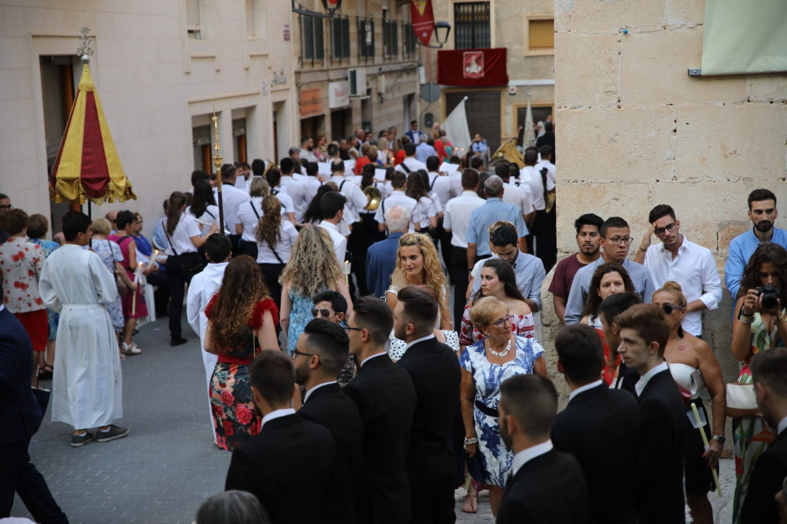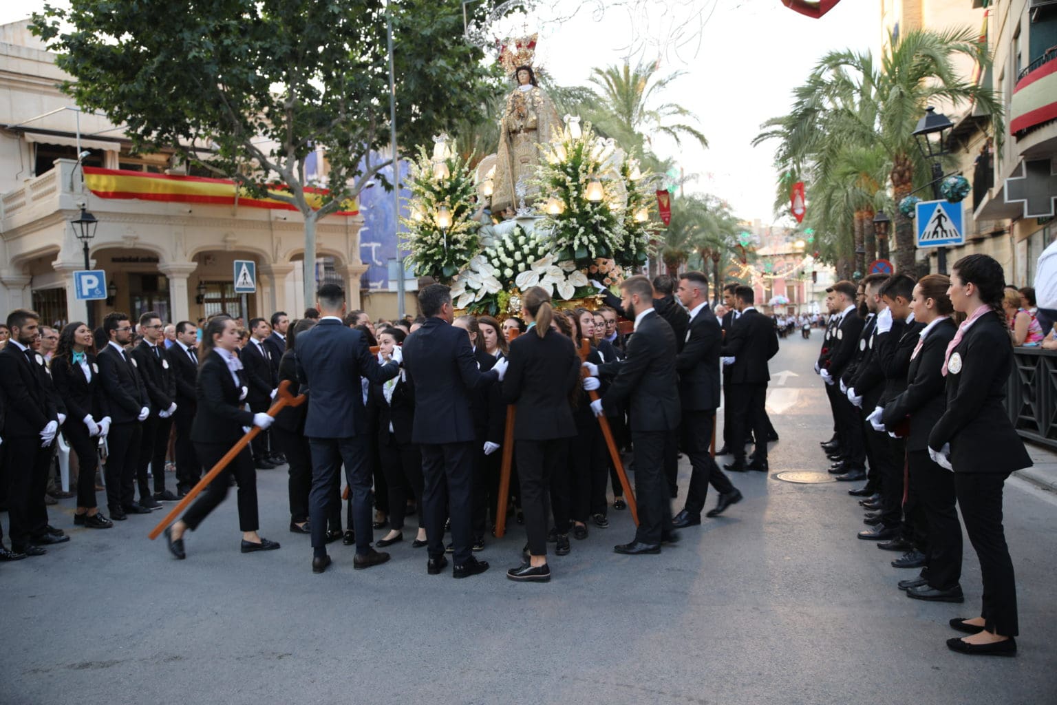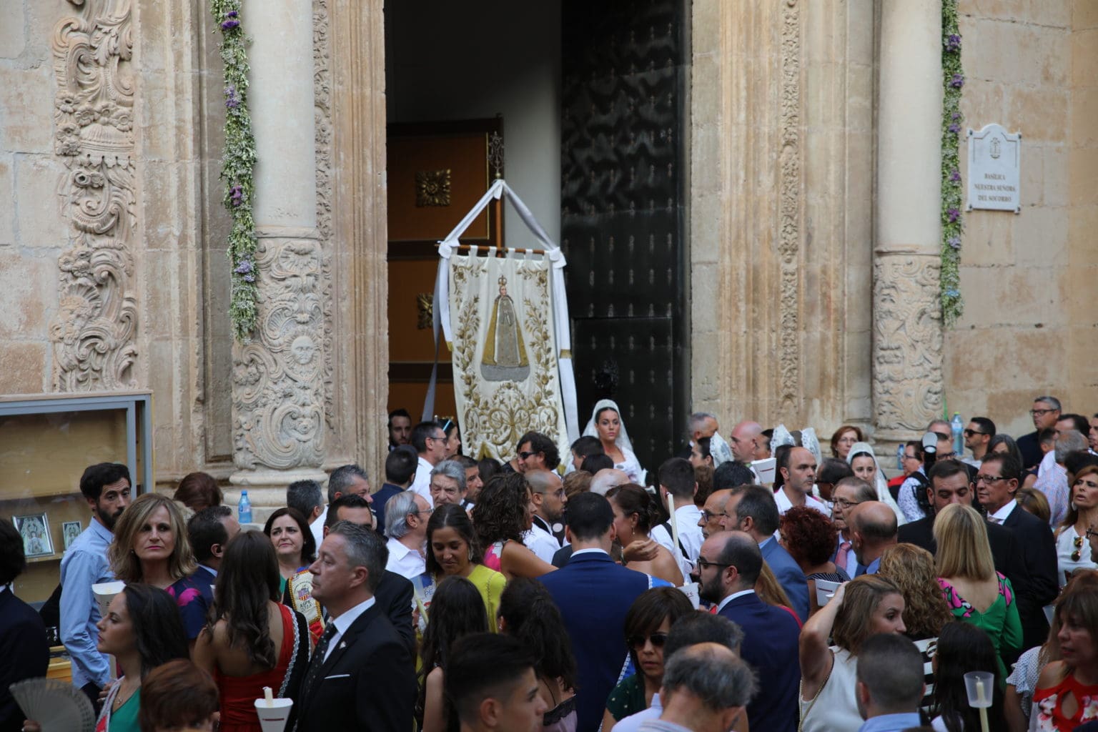 Las campanas de la Basílica de Nuestra Señora del Socorro de Aspe repiqueteaban con regocijo, eran las ocho y la luz del día no quería perderse la salida de la procesión de la patrona del municipio aspense. Los vecinos aprovechando el buen clima esperaban en las calles céntricas que la Virgen llegase hasta ellos para darle sus muestras de cariño. Aspe comparte patrona con el municipio de Hondón de las Nieves y los primeros en salir fueron la agrupación musical de La Serranica. Las Damas de Honor de Aspe y del Hondón de las Nieves, abanderados, festeros y fieles de la patrona acompañaban a la Virgen de las Nieves donde el colorido de los trajes tradicionales y de los porteadores del busto eran la tónica de una procesión que vecinos y curiosos deseaban verla pasar por su casco histórico. Los porteadores del busto, aproximadamente unos cien chicos y chicas que acaban de cumplir los dieciocho años, se turnaban durante el recorrido para llevar sobre sus hombros a su virgen. Las Damas de Honor con su ostentosa indumentaria iban delante de la virgen y detrás de la talla, el clero y autoridades civiles. A las diez de la noche, ante un plaza llena de aspenses y curiosos, se escucharon los cánticos en devoción a la talla de Nuestra Señora de las Nieves en el escenario de la plaza mayor.