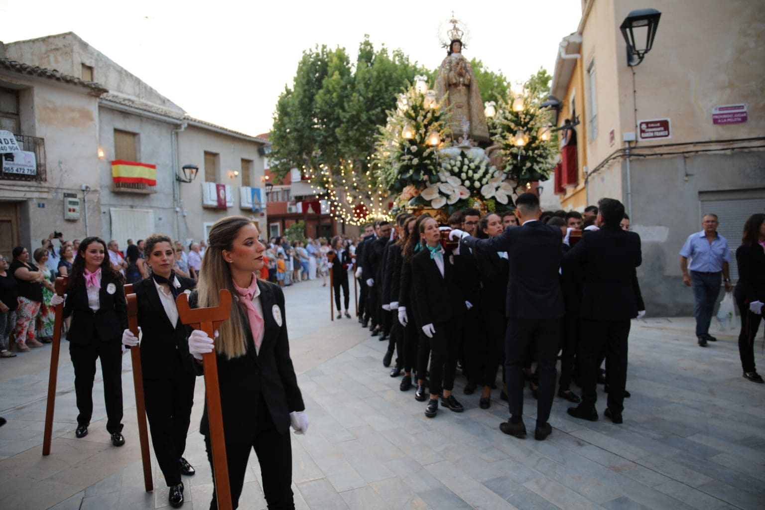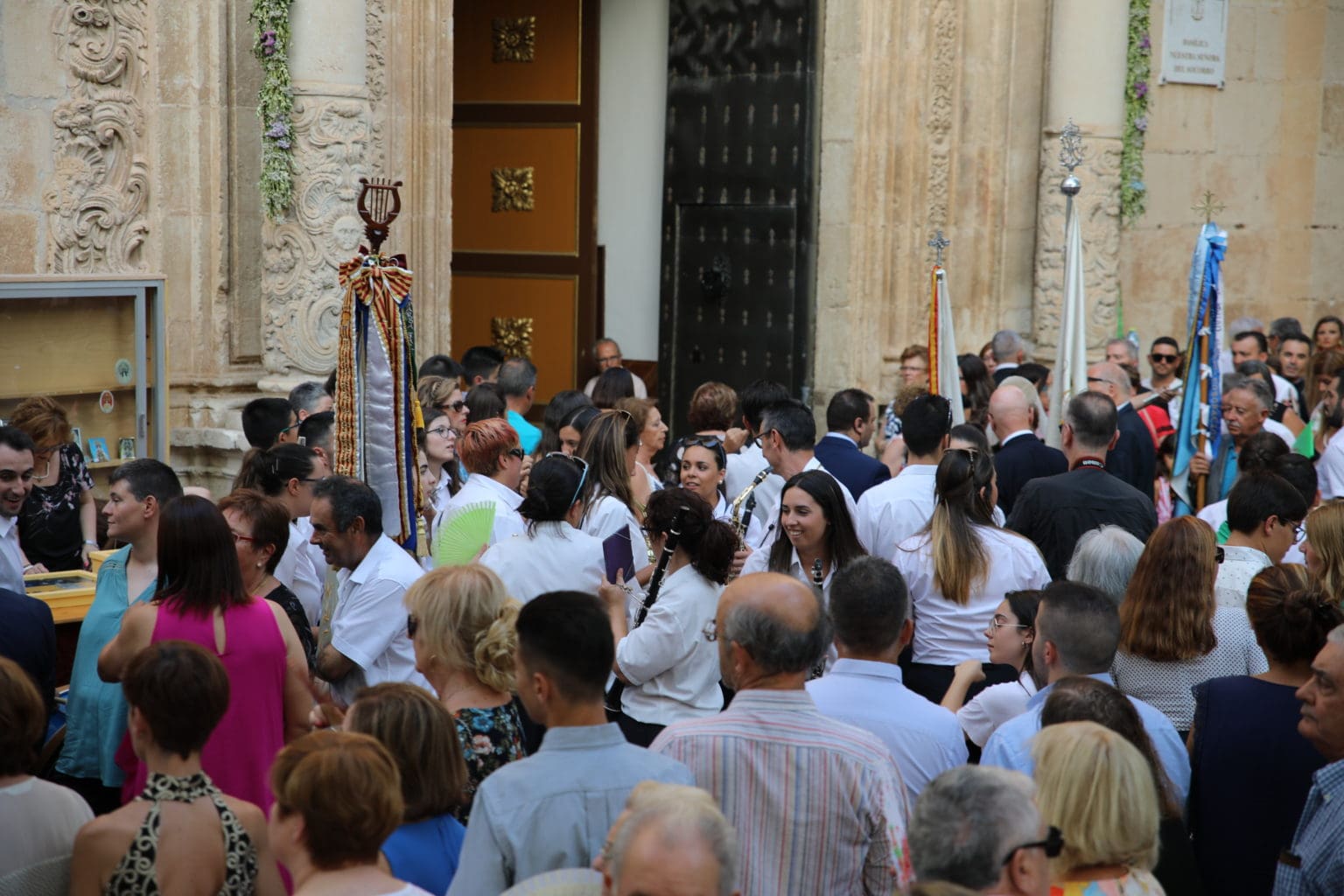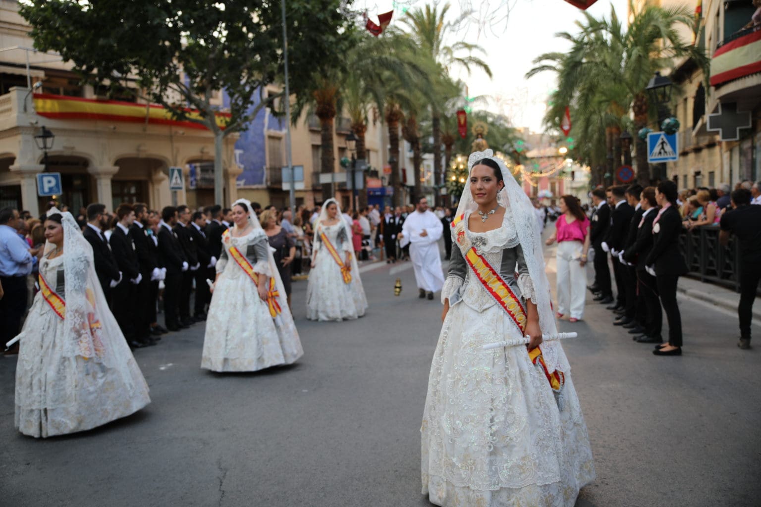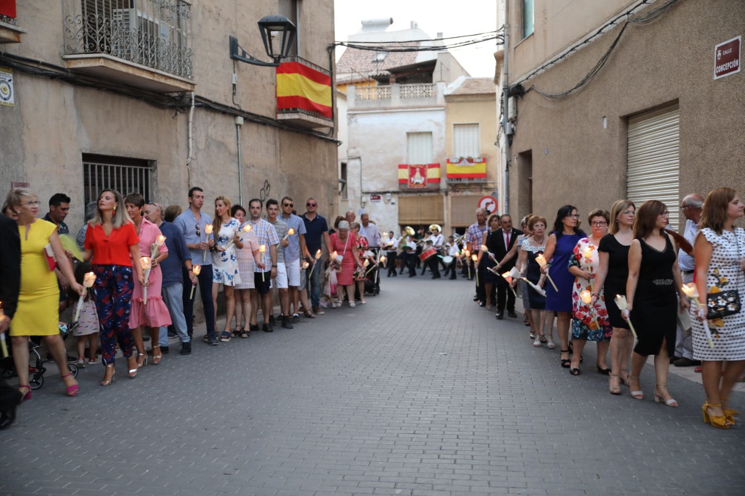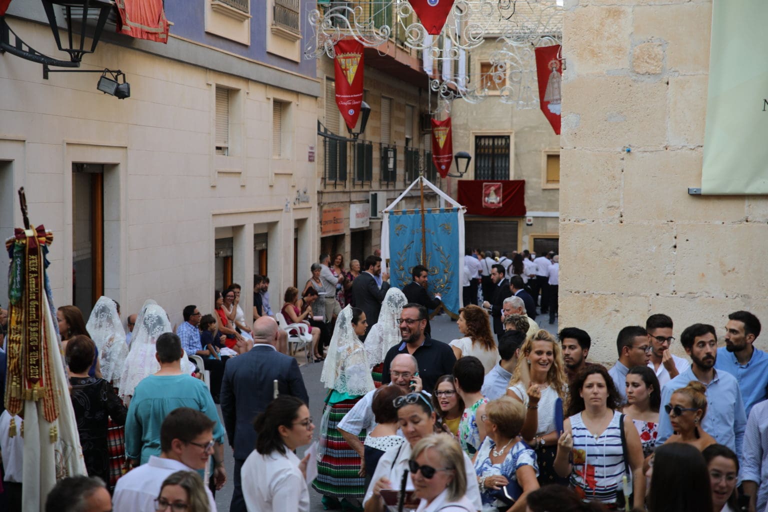 Las campanas de la Basílica de Nuestra Señora del Socorro de Aspe repiqueteaban con regocijo, eran las ocho y la luz del día no quería perderse la salida de la procesión de la patrona del municipio aspense. Los vecinos aprovechando el buen clima esperaban en las calles céntricas que la Virgen llegase hasta ellos para darle sus muestras de cariño. Aspe comparte patrona con el municipio de Hondón de las Nieves y los primeros en salir fueron la agrupación musical de La Serranica. Las Damas de Honor de Aspe y del Hondón de las Nieves, abanderados, festeros y fieles de la patrona acompañaban a la Virgen de las Nieves donde el colorido de los trajes tradicionales y de los porteadores del busto eran la tónica de una procesión que vecinos y curiosos deseaban verla pasar por su casco histórico. Los porteadores del busto, aproximadamente unos cien chicos y chicas que acaban de cumplir los dieciocho años, se turnaban durante el recorrido para llevar sobre sus hombros a su virgen. Las Damas de Honor con su ostentosa indumentaria iban delante de la virgen y detrás de la talla, el clero y autoridades civiles. A las diez de la noche, ante un plaza llena de aspenses y curiosos, se escucharon los cánticos en devoción a la talla de Nuestra Señora de las Nieves en el escenario de la plaza mayor.